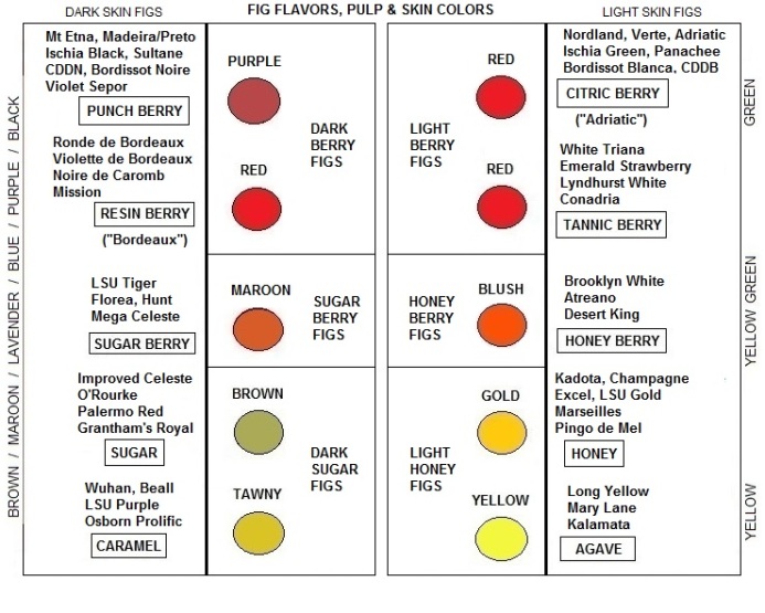 Honey-berry figs can be found in the fig flavor spectrum between yellow honey figs and green berry figs. The skins of the honey-berry figs tend to be greenish or yellowish with light red and translucent pulp, darker than pink, lighter than berry red, partly honey, partly berry flavored. Occasionally the pulp can range to golden or to dark red. Mainly, the pulp is light red. Tasting more of juice than of jam, these figs have fresh, light berry flavors compared to the intense berry flavors of the full berry figs. Brooklyn White is the Queen of the honey-berry figs for short season growers.