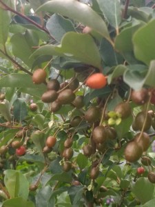 Goumi berry is not a grape nor grape related but has the flavor of a mild cherry grape. A cherry flavor grape. It tastes as it looks. The soft nutty seed or pit inside can be chewed and sucked of its mild sunflower seed-like flavor then the remaining woody fibers swallowed or spat out.