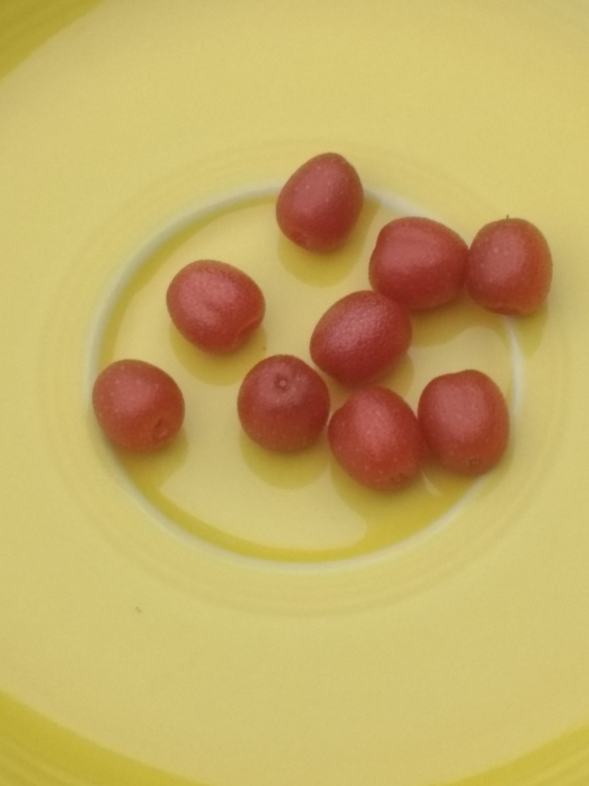 Taste profile seems similar to a Granny Smith apple, with mild cherry flavor and grape texture. Sunflower type husk and seed in the middle interior.