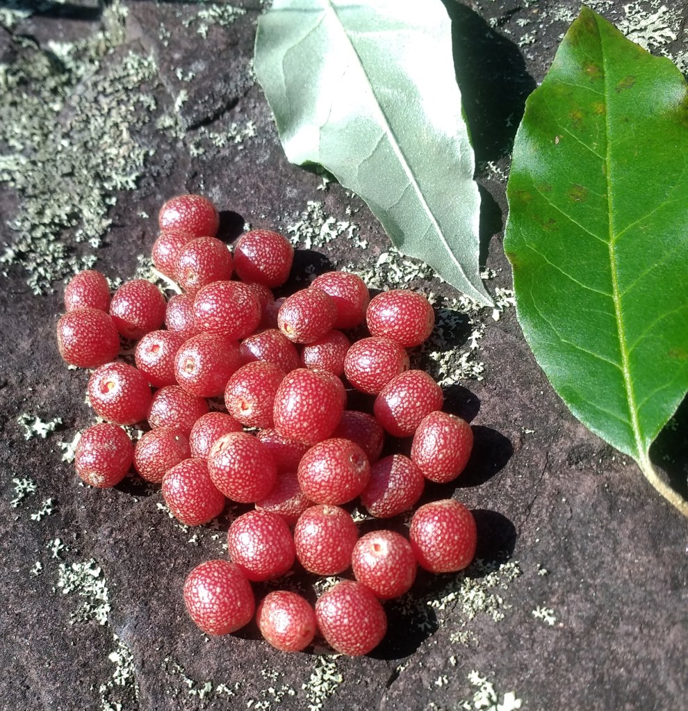 I had my first encounter with E. unbellata last year, when it ripened in October and I picked a couple gallons of berries in a very short time – they were THICK on the tree! Much larger fruit than the semi-wild E. angustifolia trees growing in my area, with much more agreeable flavor, color and size. If I’m going to pick berries, I’d far rather pick BIG ones that taste great! Umbellata make wonderful jam or jelly – I put mine through a Squeezo-type strainer (with the short GRAPE spiral, or it jams!) and it worked splendidly with a currant-jelly recipe. The seeds aren’t any harder than grape seeds, being chewable, but I didn’t think they belonged in my jam. I will not mind at all having these growing in my food-hedge in the future! The sheer volume of the berries means the birds can eat all they want, and there will likely still be plenty for me. They ripen at a time when the berry season is winding down, too, so the birds can fatten up for migration, or just wintering-over. I will also try drying these, although they’d probably do better as fruit leather, after straining out the seeds.
