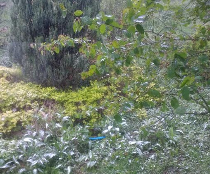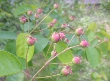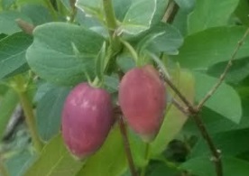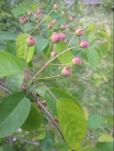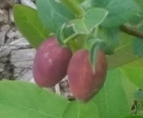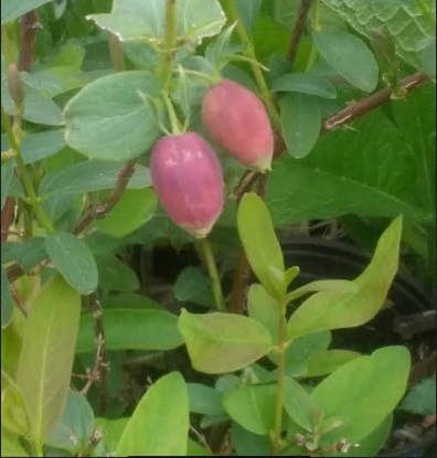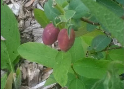 A day after a dusting of snow, some of the first berries of spring begin to blush toward being ripe, juneberries aka serviceberries and blue honeysuckle berries, variety Kuchi aka Maxie.