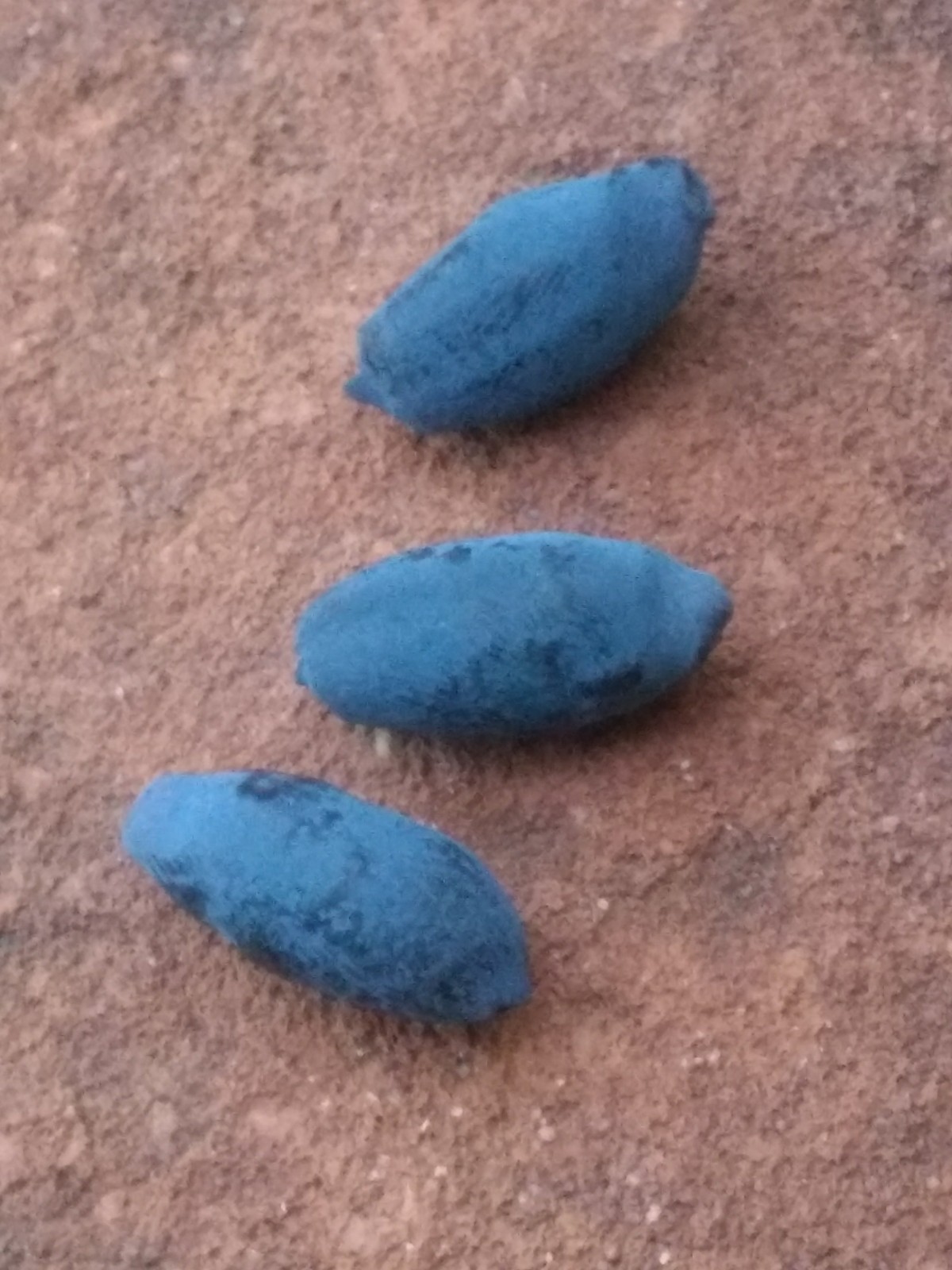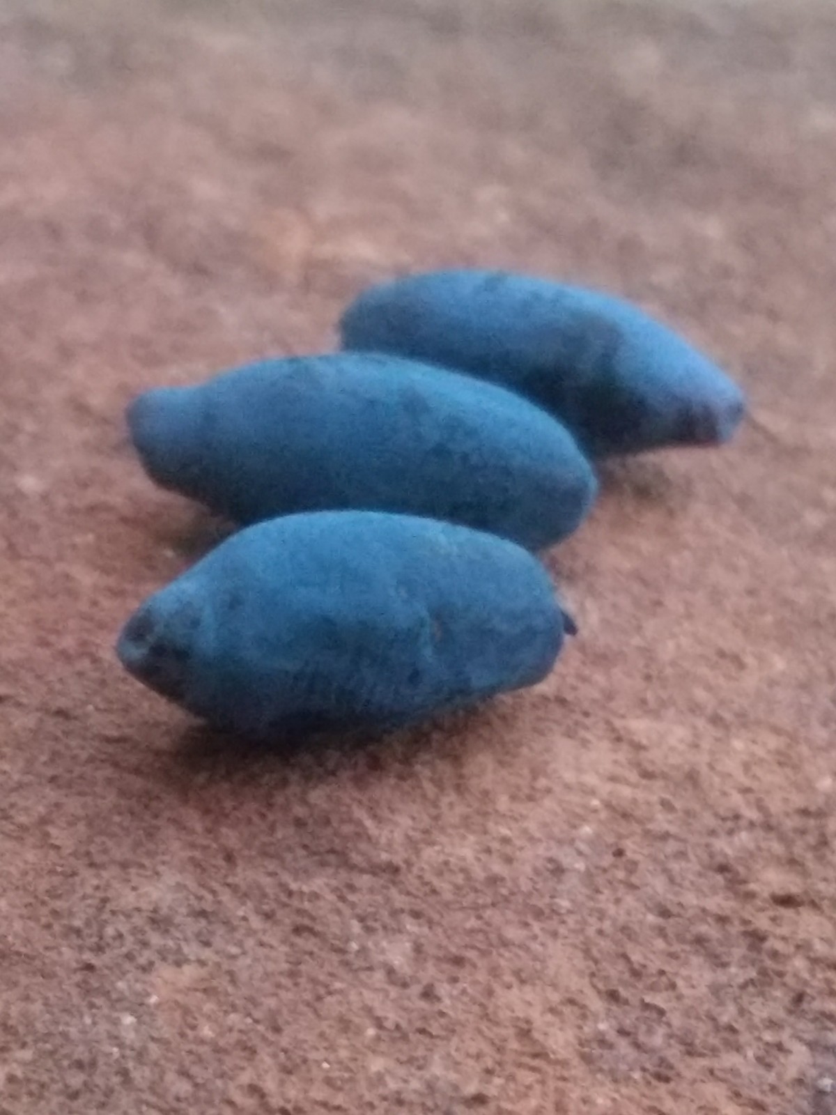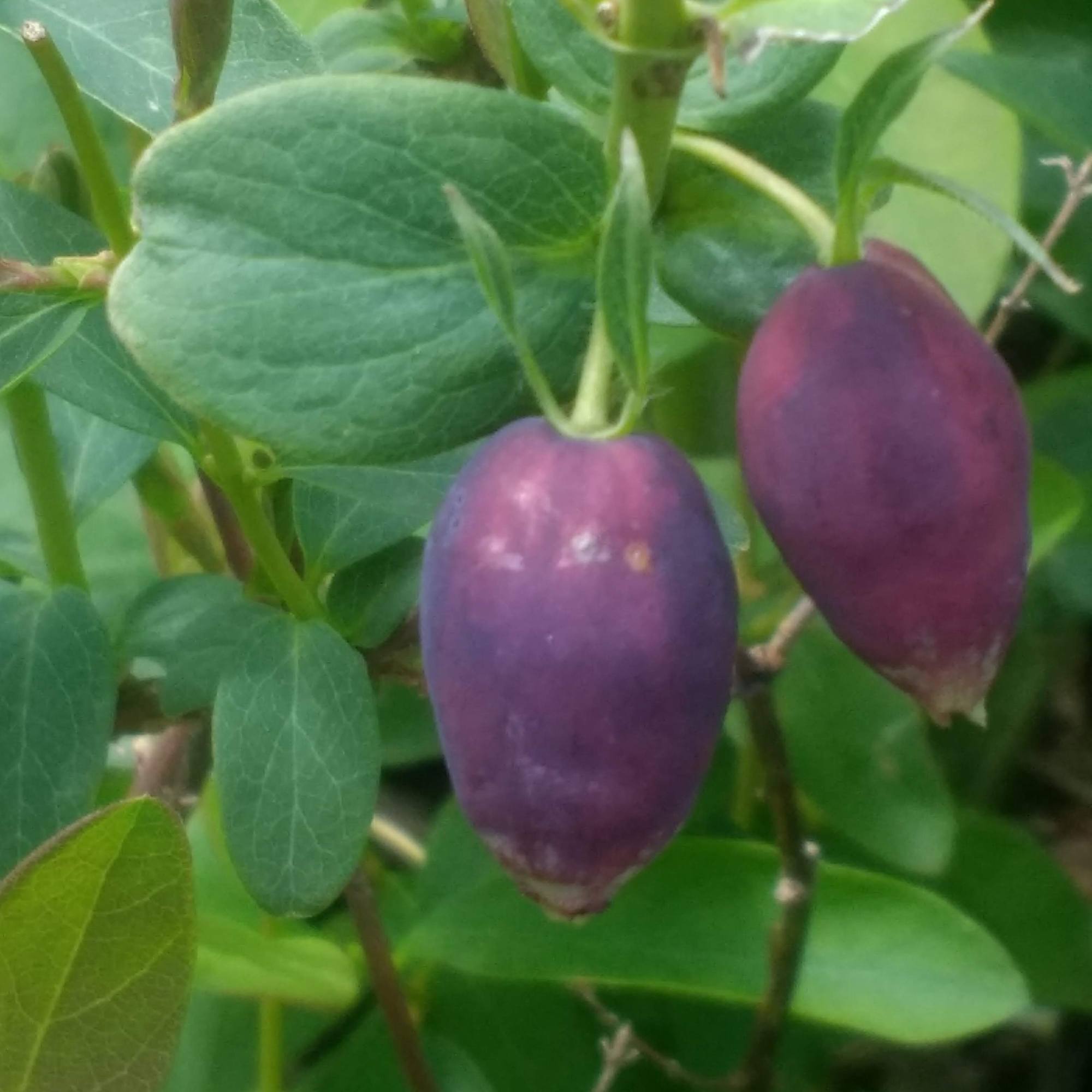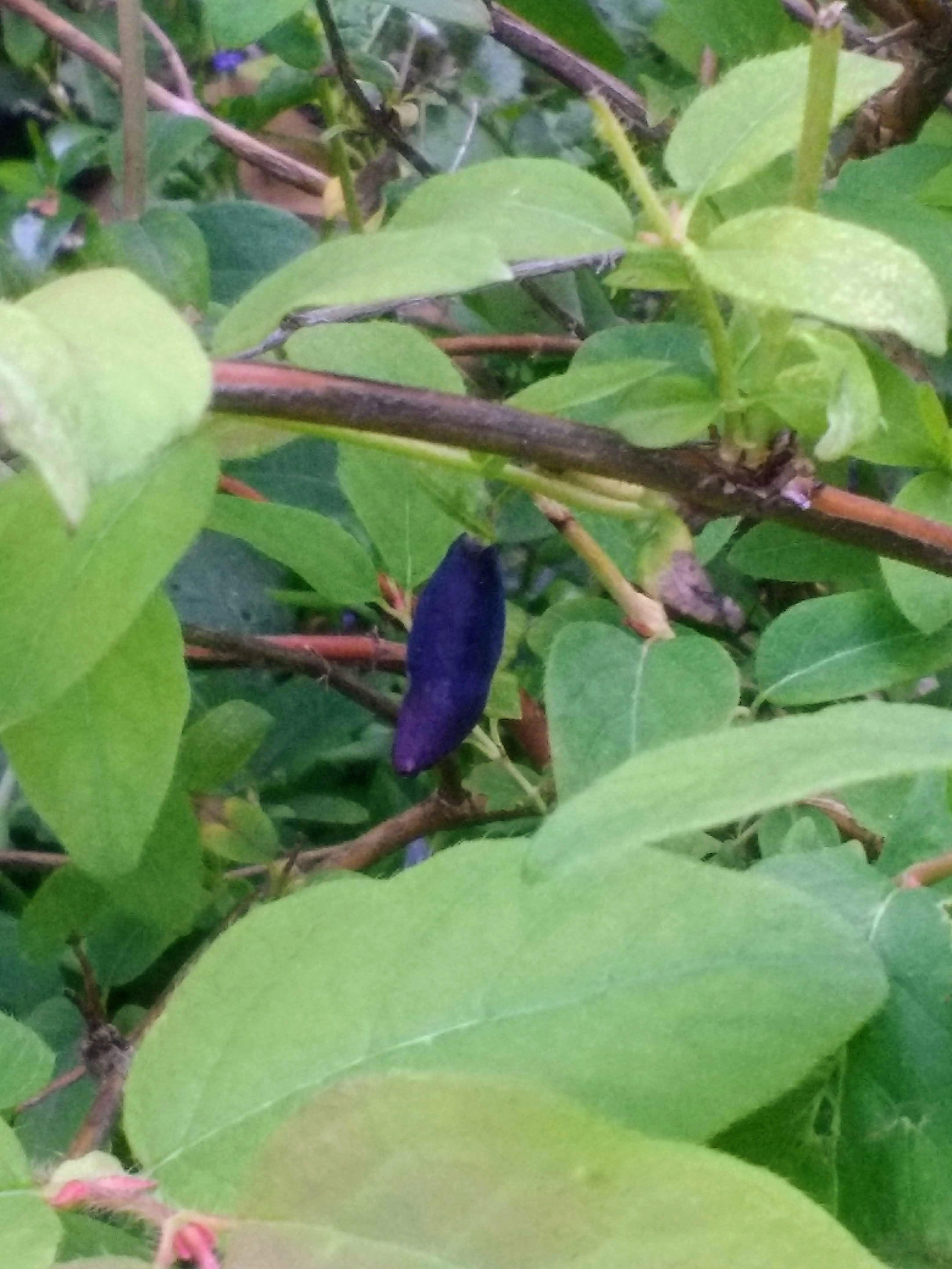 Three days after snow and the final freeze (hopefully, 28 F), the first blue honeysuckle berry is picked ripe with the gel texture of a grape and the flavor of a mild wild blueberry. This berry was probably ripe days ago but overlooked on the little bush. Blue Diamond variety.