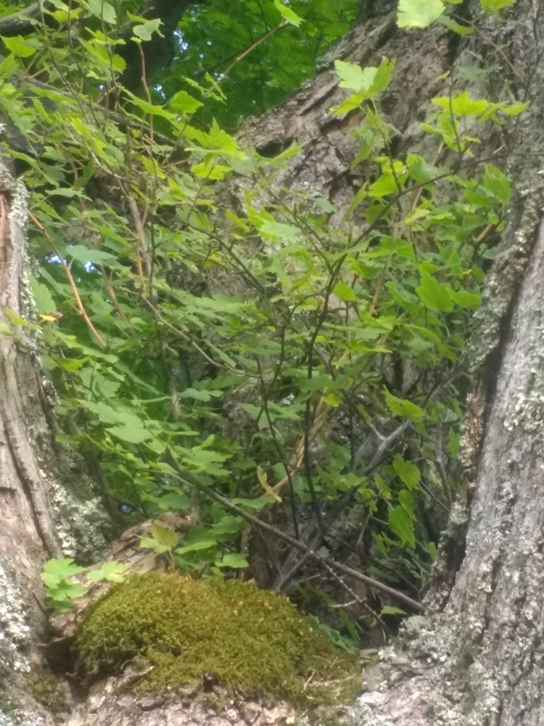 Ten feet high in the crook of a tree, on a hilltop, a gooseberry bush thrives at about 1800 feet elevation, zone 5 northeastern Pennsylvania, summer 2020.