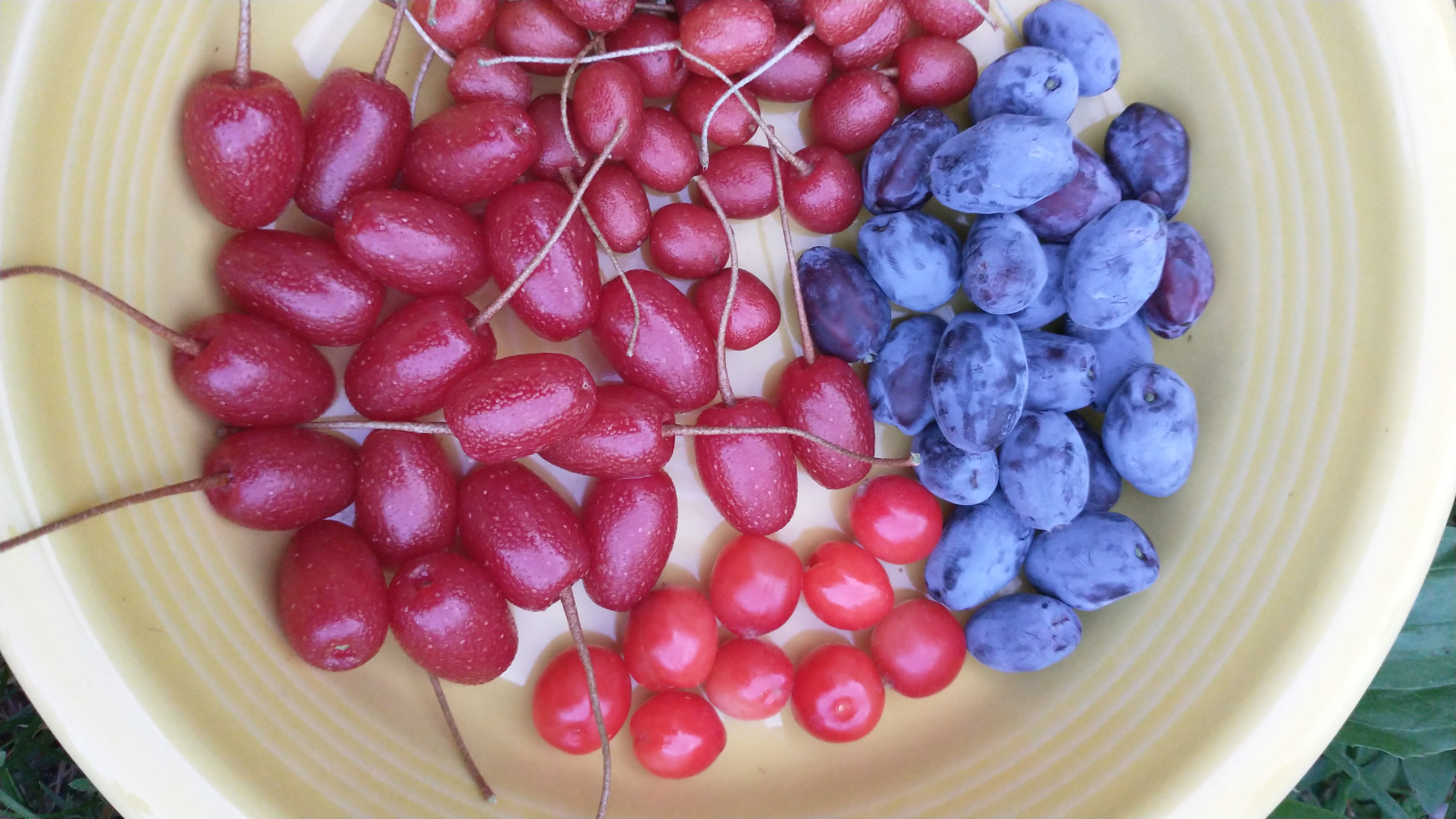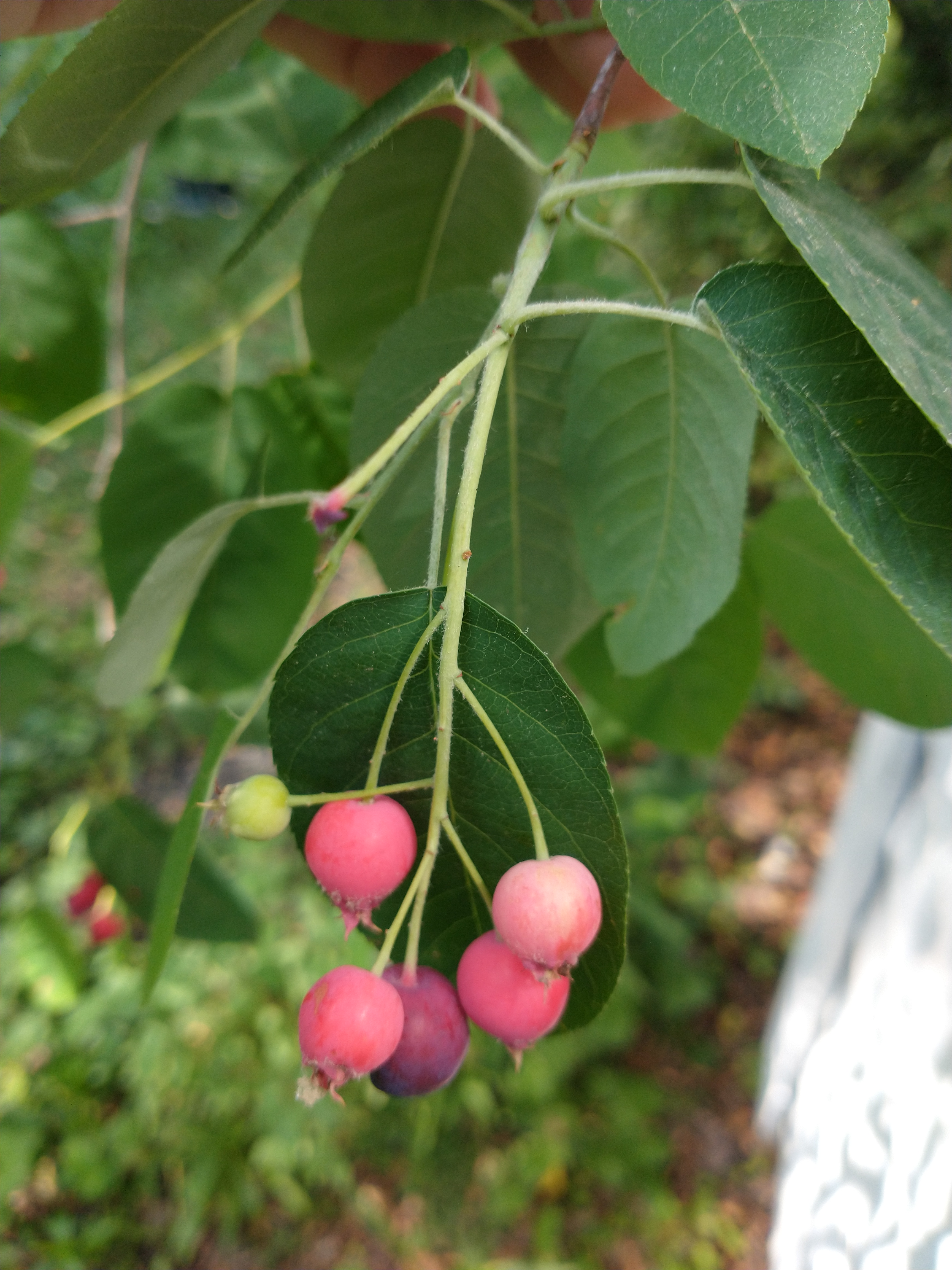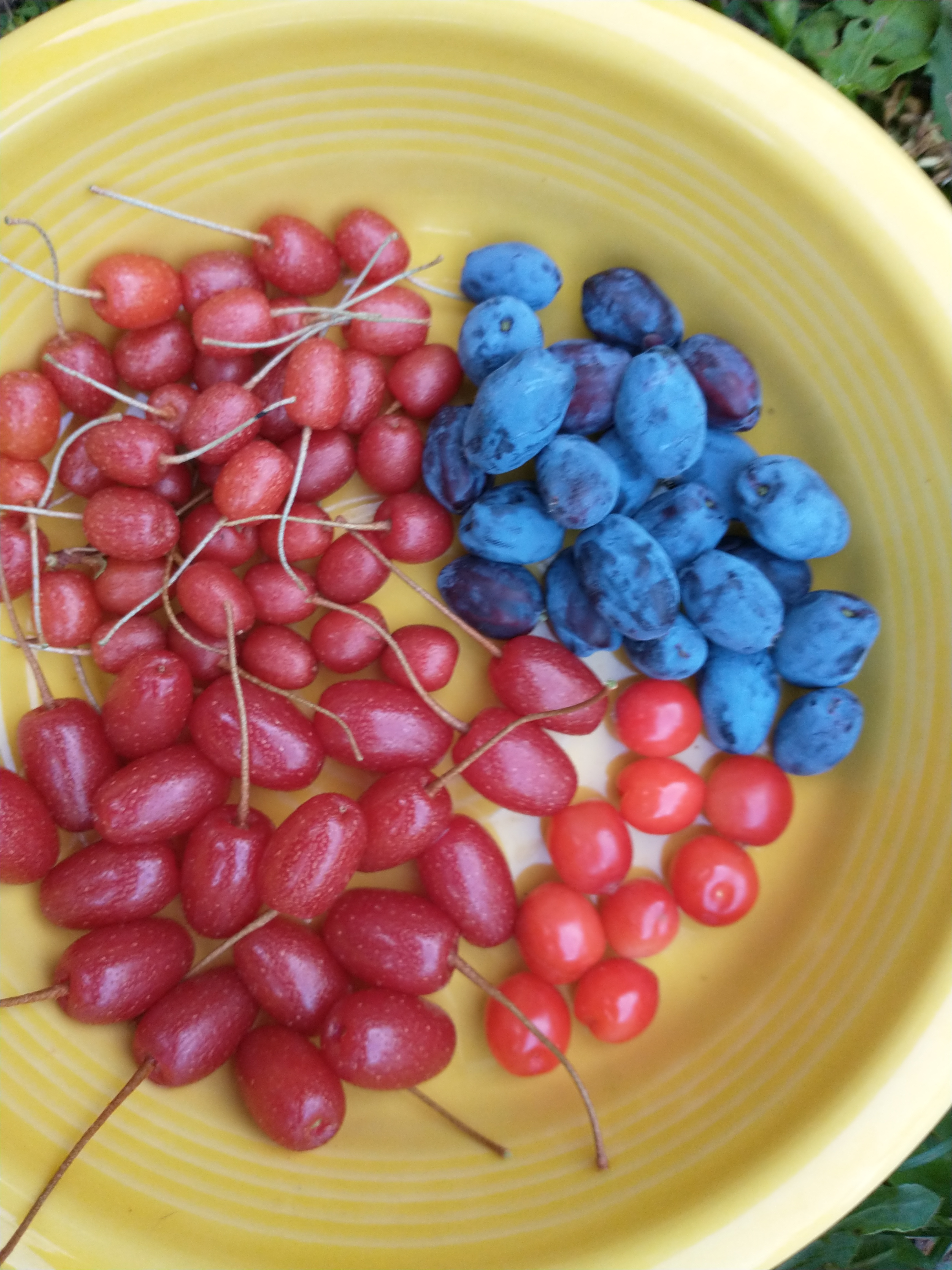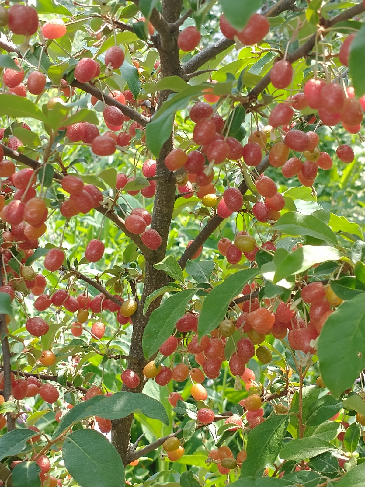 Excluding for the moment Juneberry, the real surprise to me here is the humble Nanking cherry. Though it colors up later than haskap or goumi, it gets sweet as early as they do, or sweeter earlier. Also, it’s a legit tree fruit that grows as low and precocious as a bush. A miniaturized tree fruit. Maybe its lack of pervasive popularity (presence in groceries) is due to it being the size of a berry but with a pit.