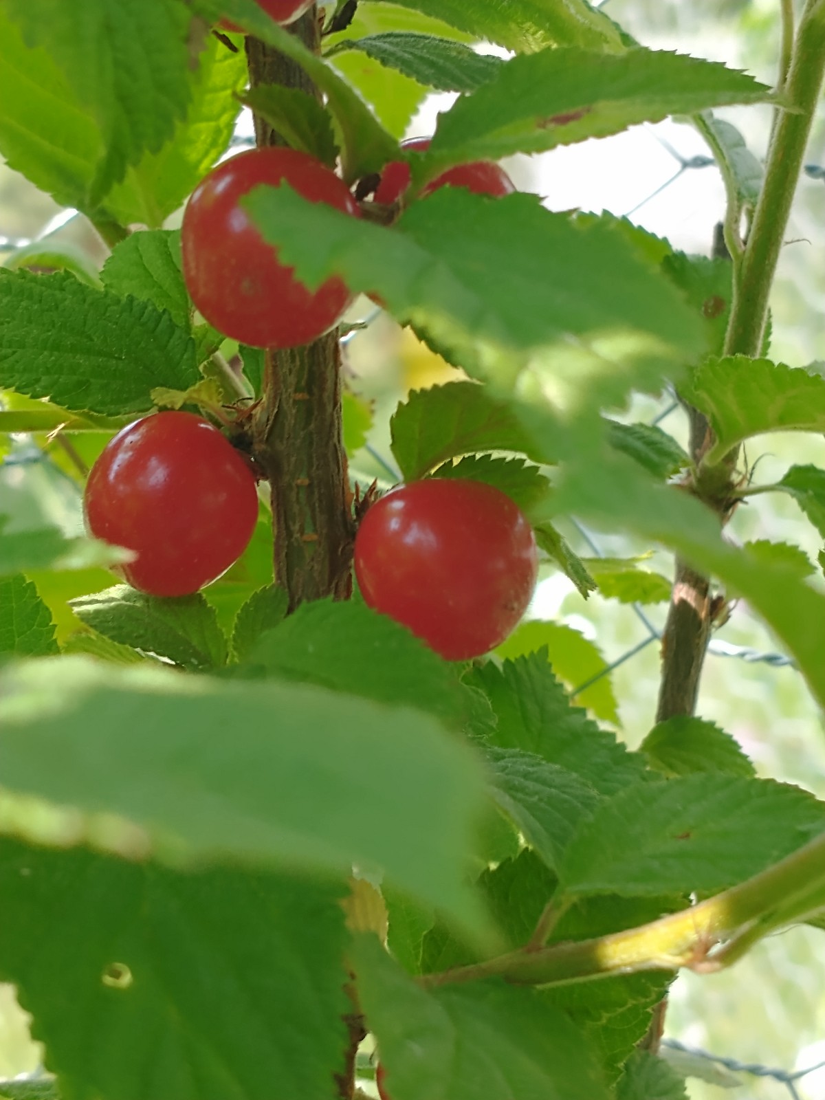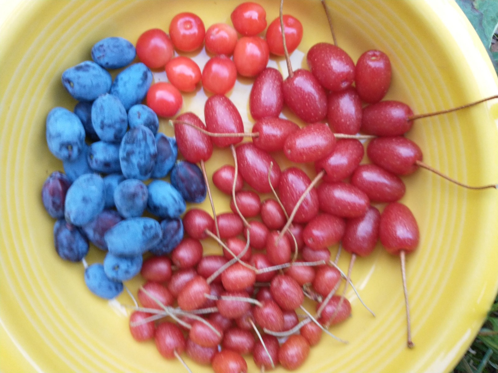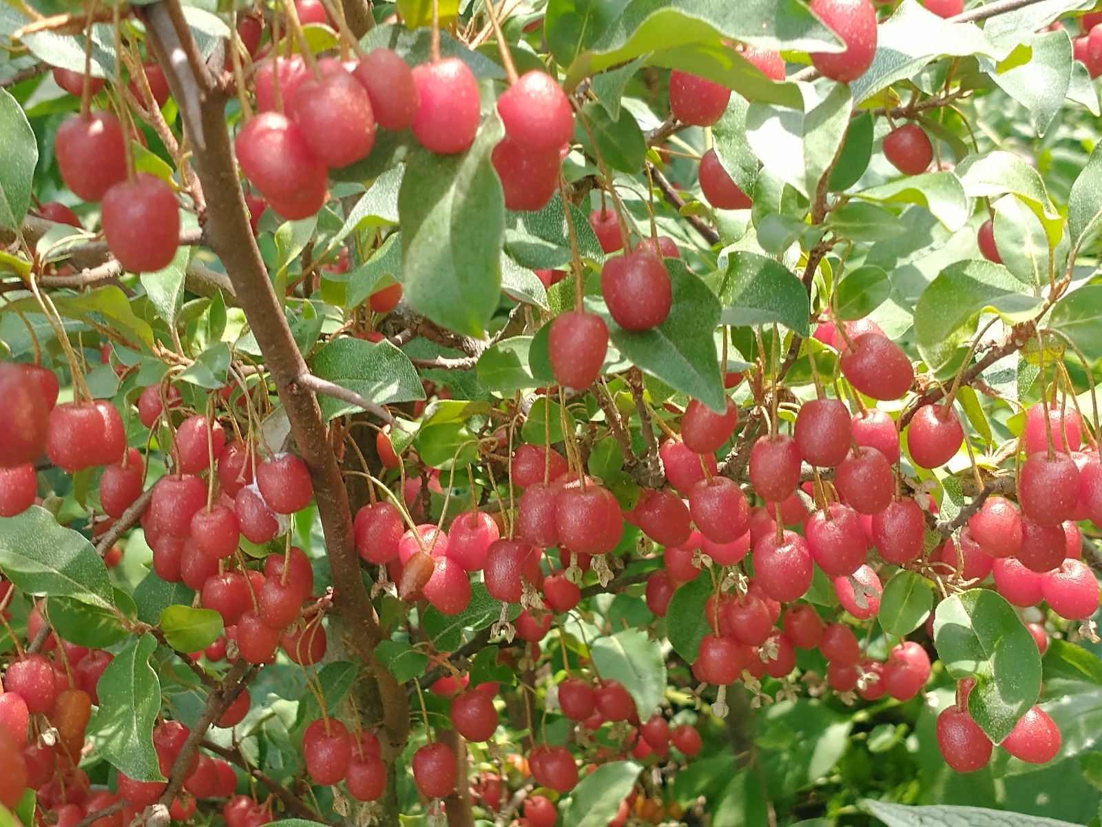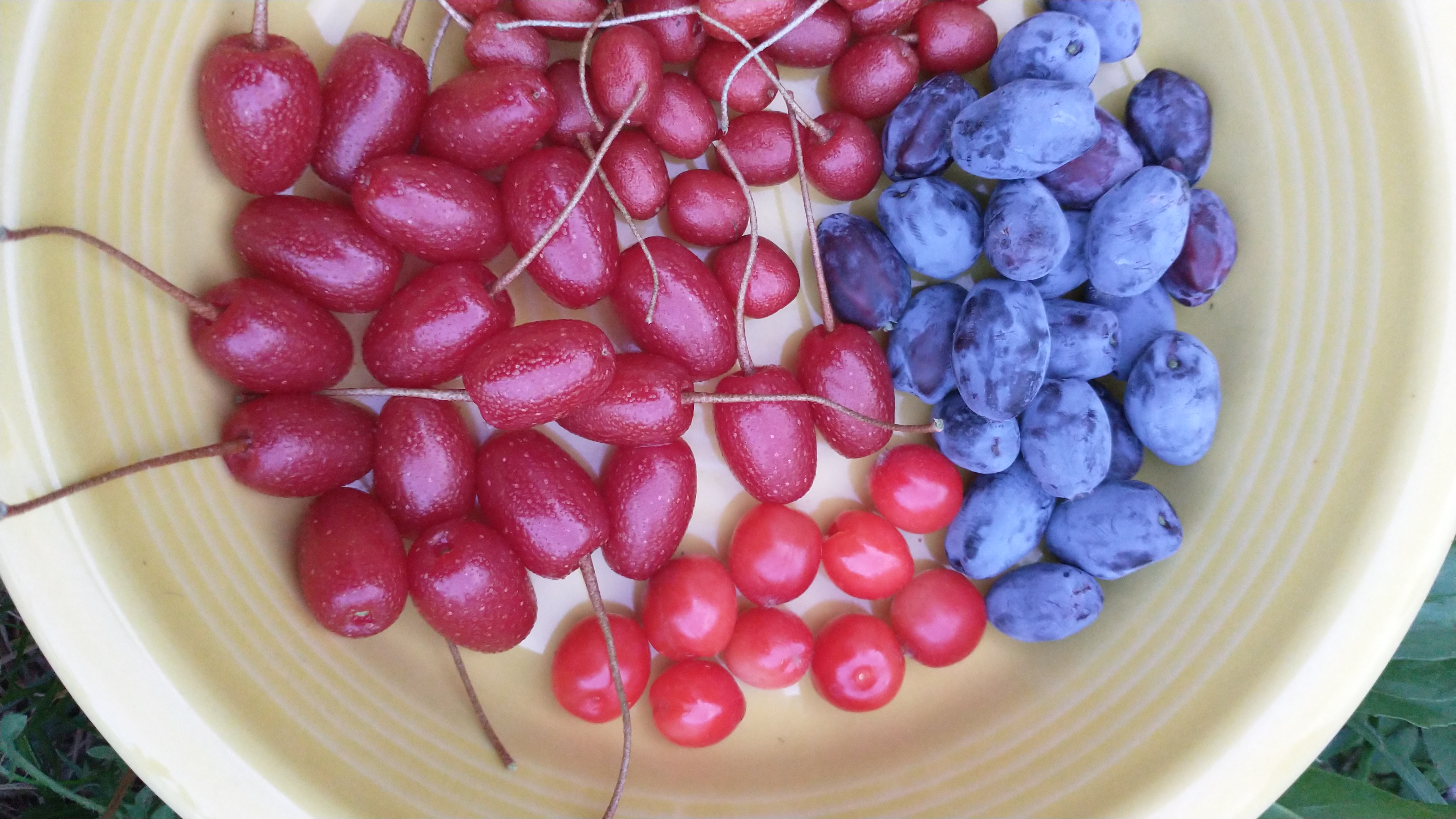 Excluding for the moment Juneberry, the real surprise to me here is the humble Nanking cherry. Though it colors up later than haskap or goumi, it gets sweet as early as they do, or sweeter earlier. Also, it’s a legit tree fruit that grows as low and precocious as a bush. A miniaturized tree fruit. Maybe its lack of pervasive popularity (presence in groceries) is due to it being the size of a berry but with a pit.