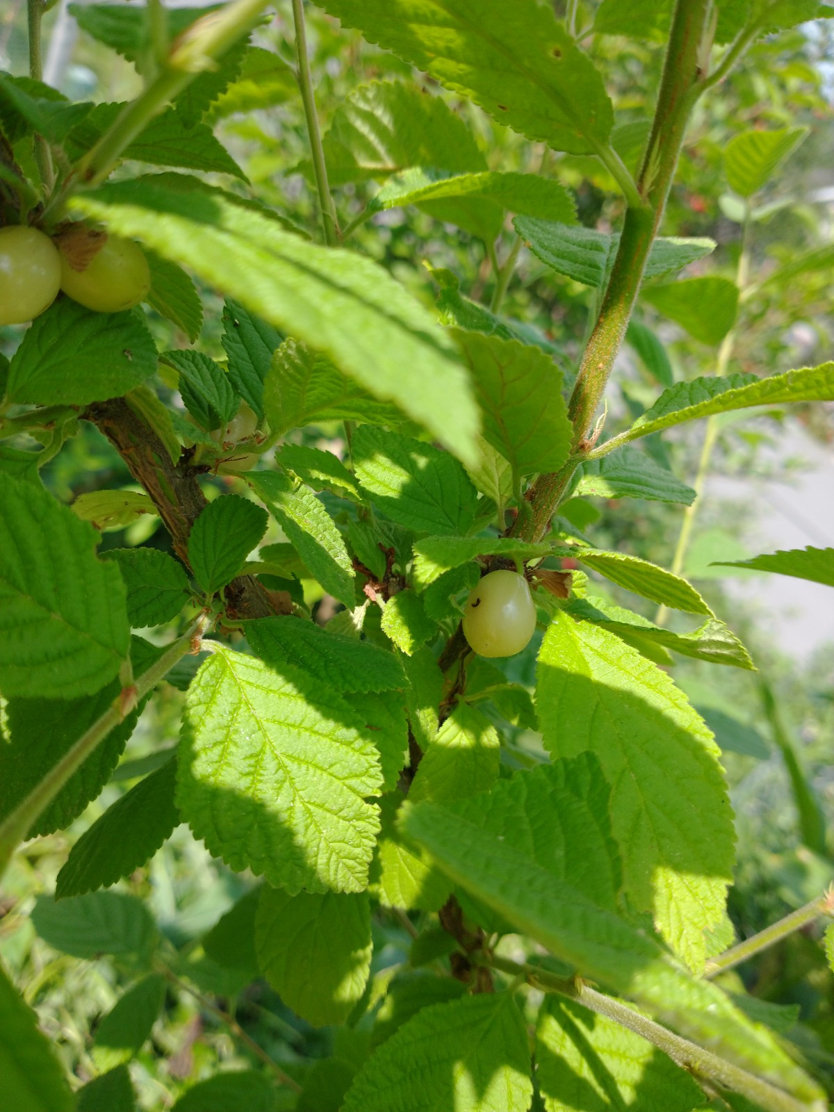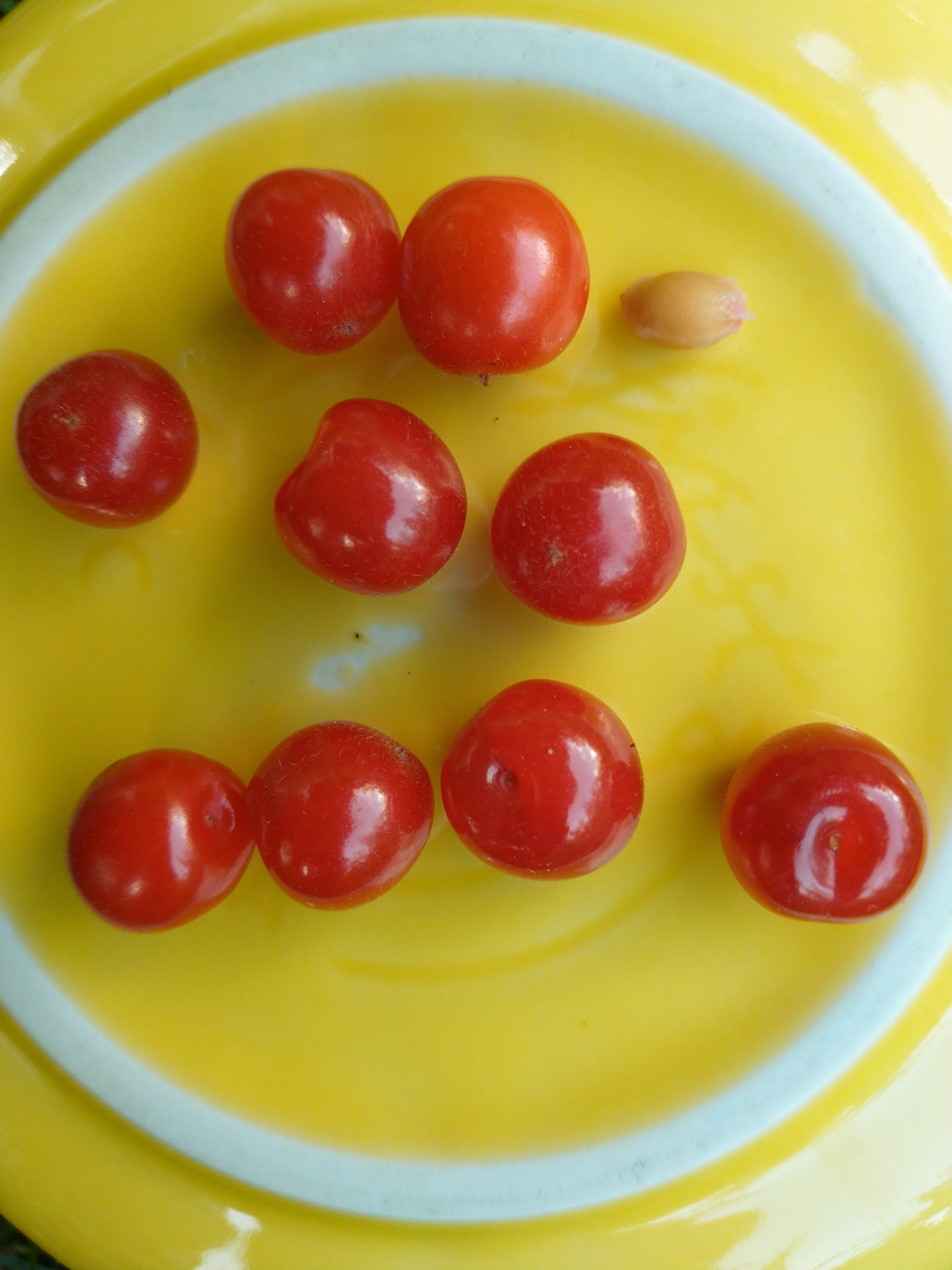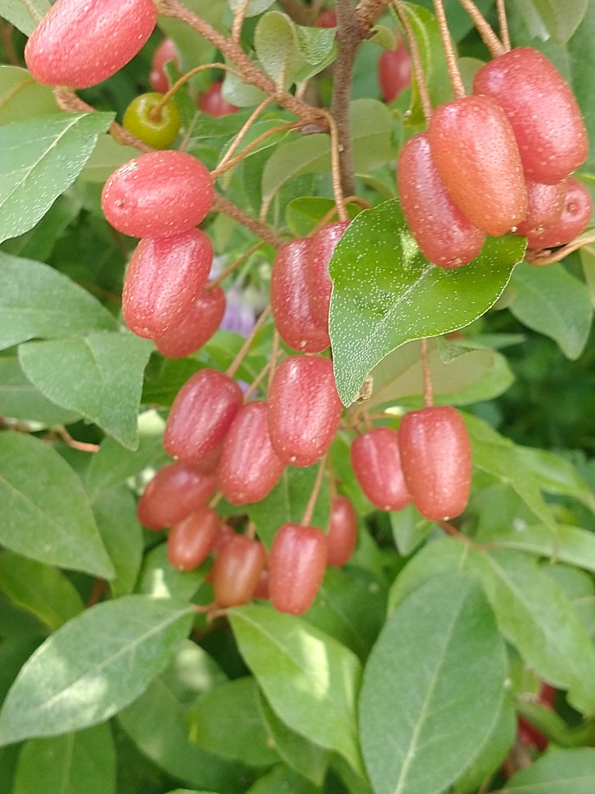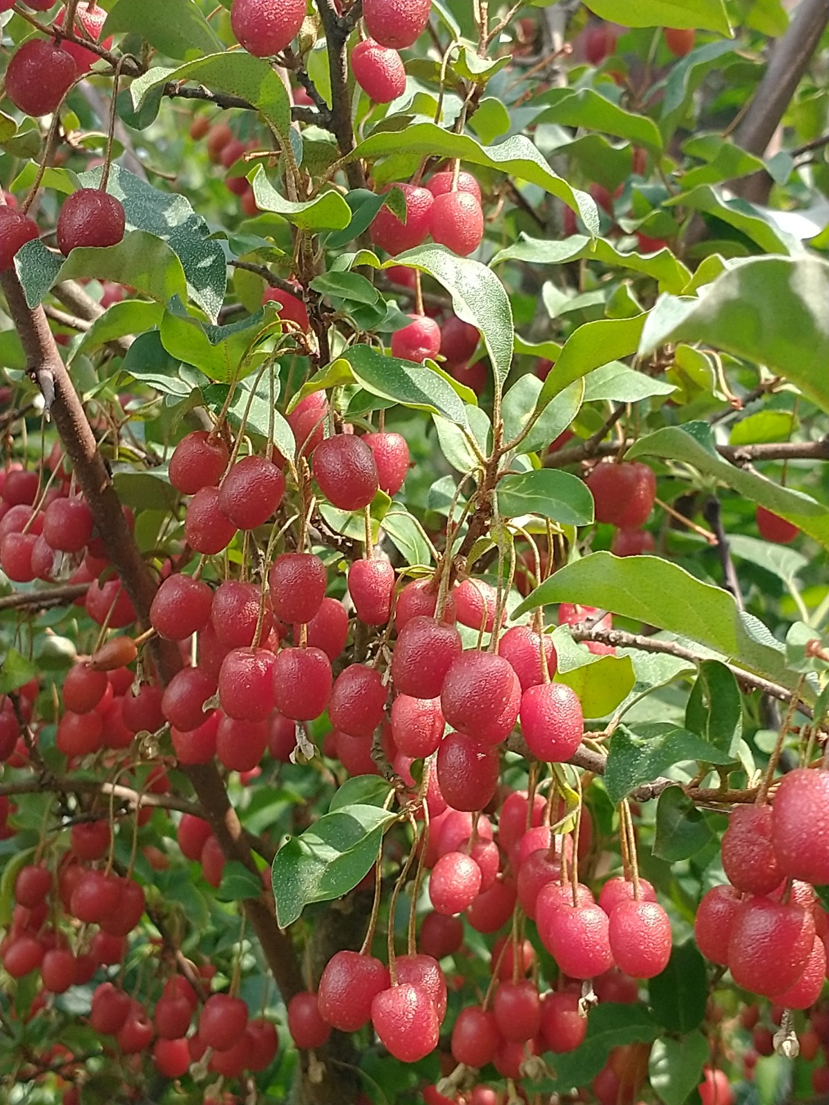 Excluding for the moment Juneberry, the real surprise to me here is the humble Nanking cherry. Though it colors up later than haskap or goumi, it gets sweet as early as they do, or sweeter earlier. Also, it’s a legit tree fruit that grows as low and precocious as a bush. A miniaturized tree fruit. Maybe its lack of pervasive popularity (presence in groceries) is due to it being the size of a berry but with a pit.
