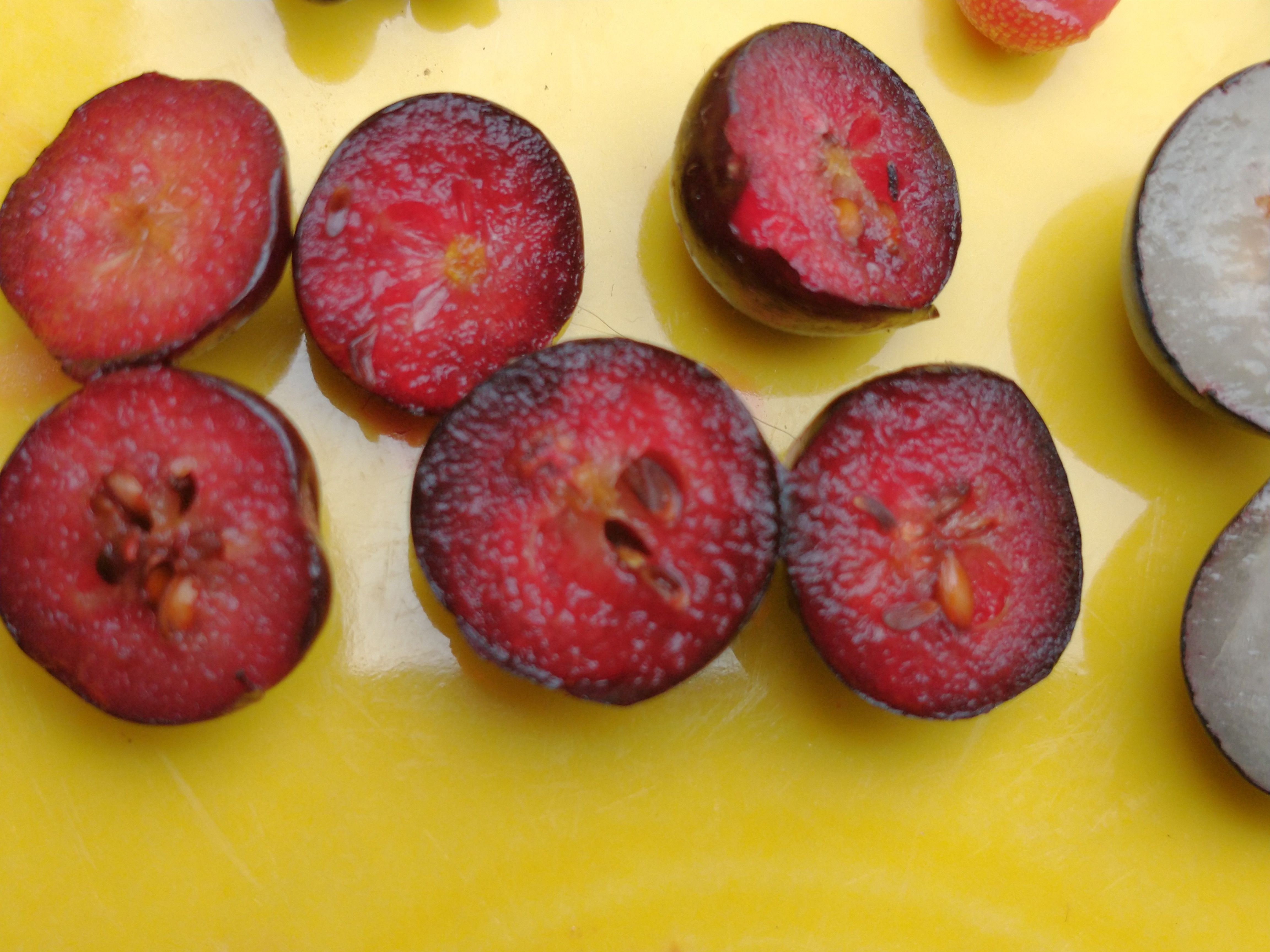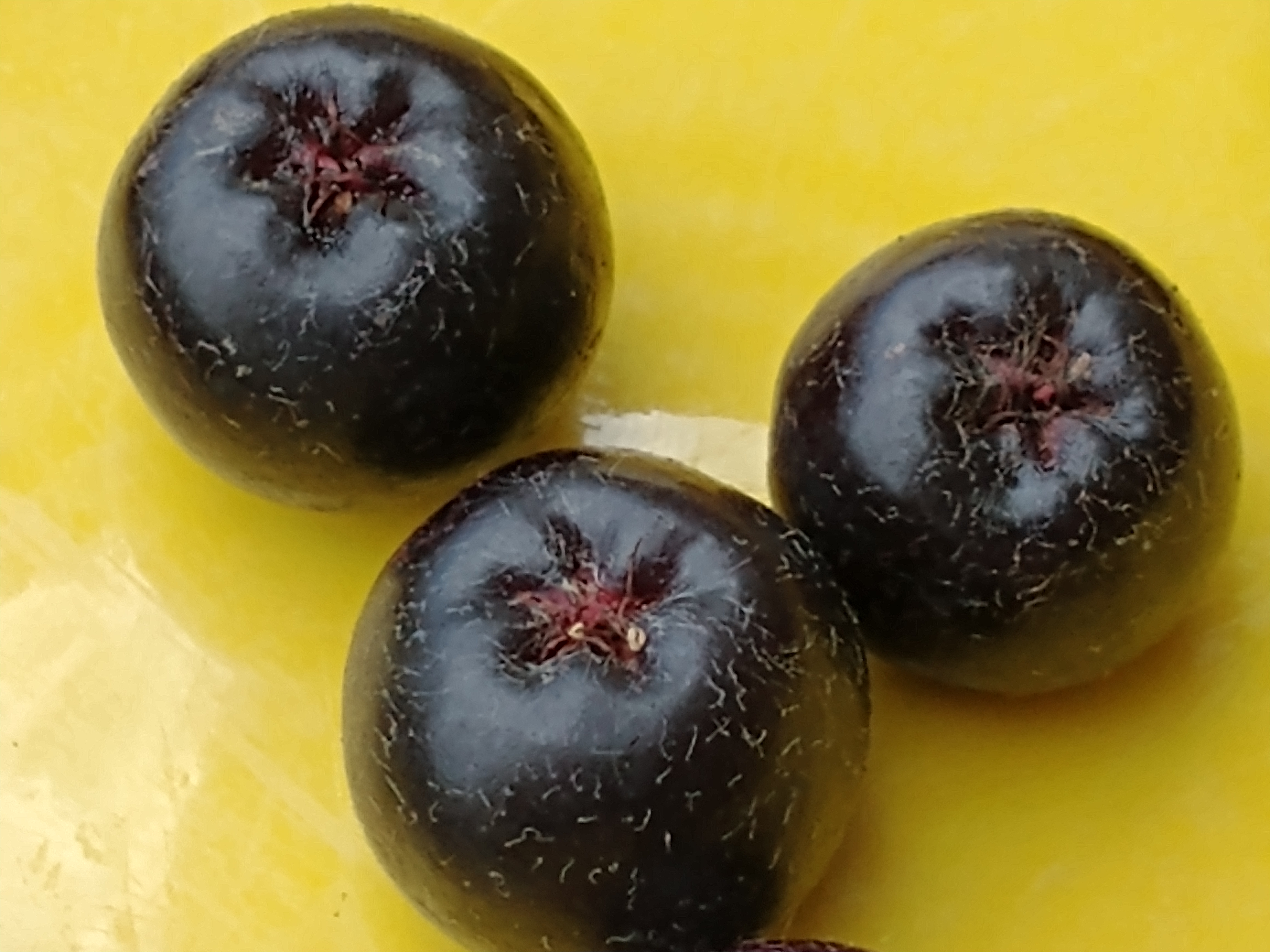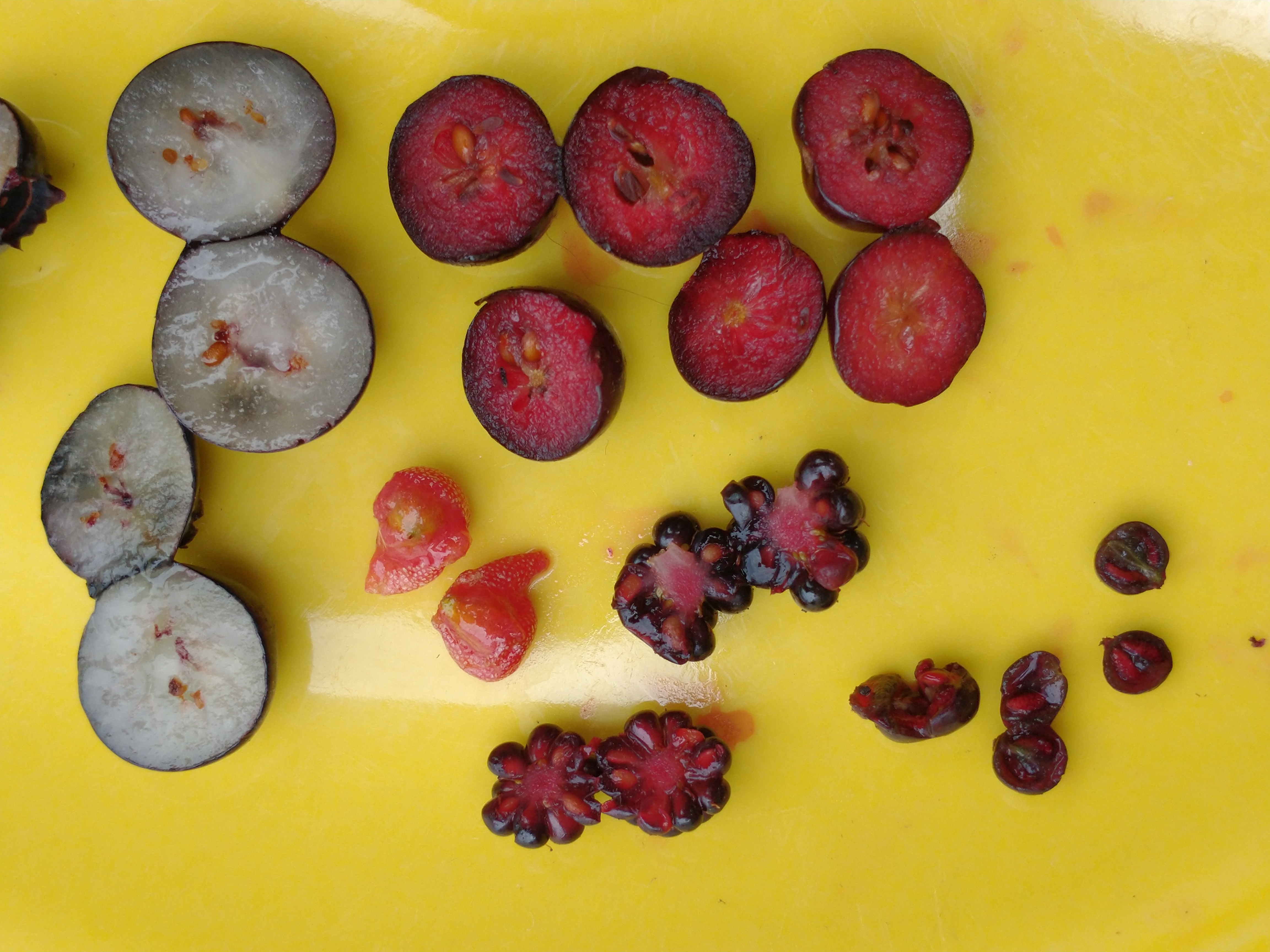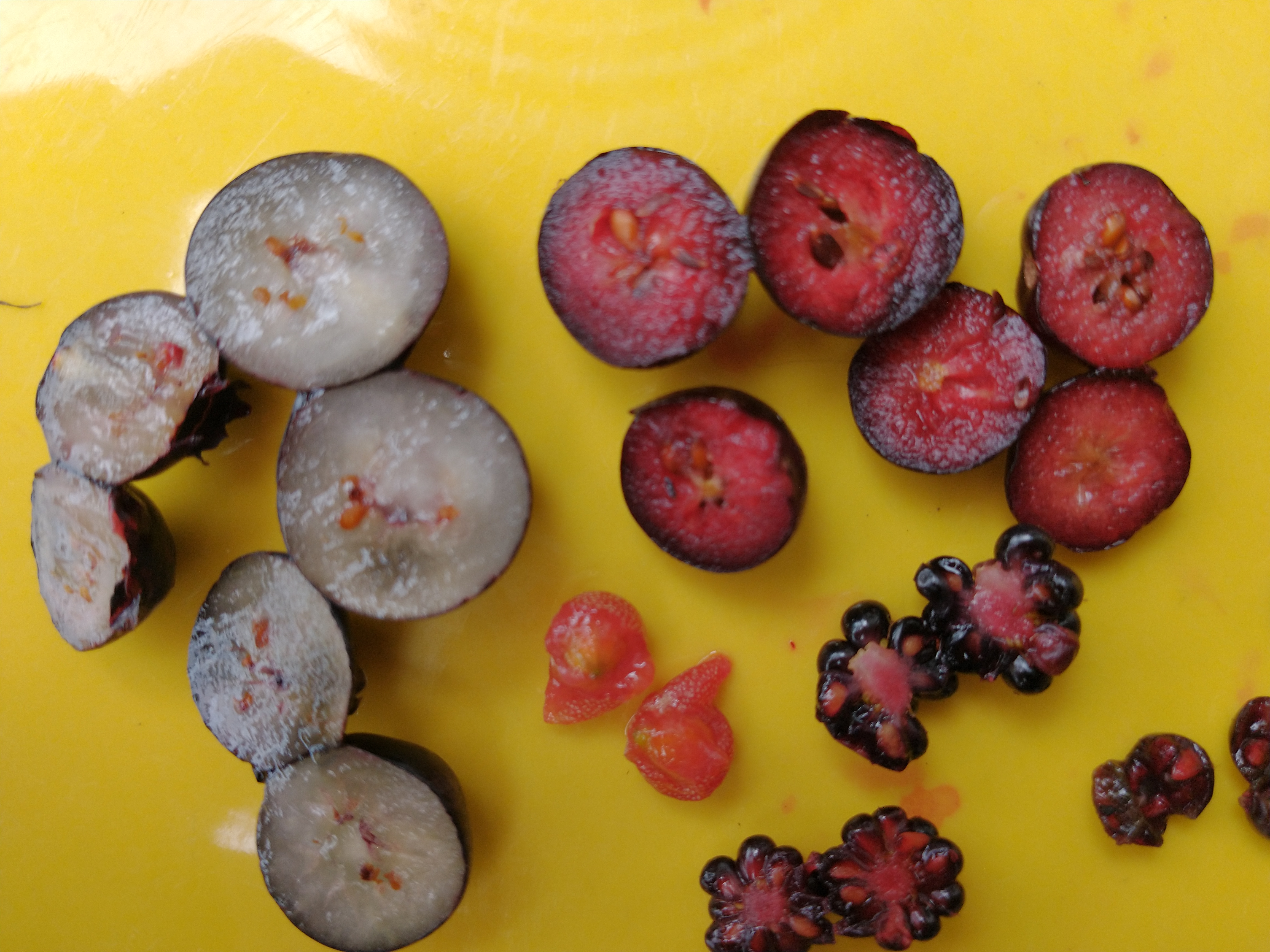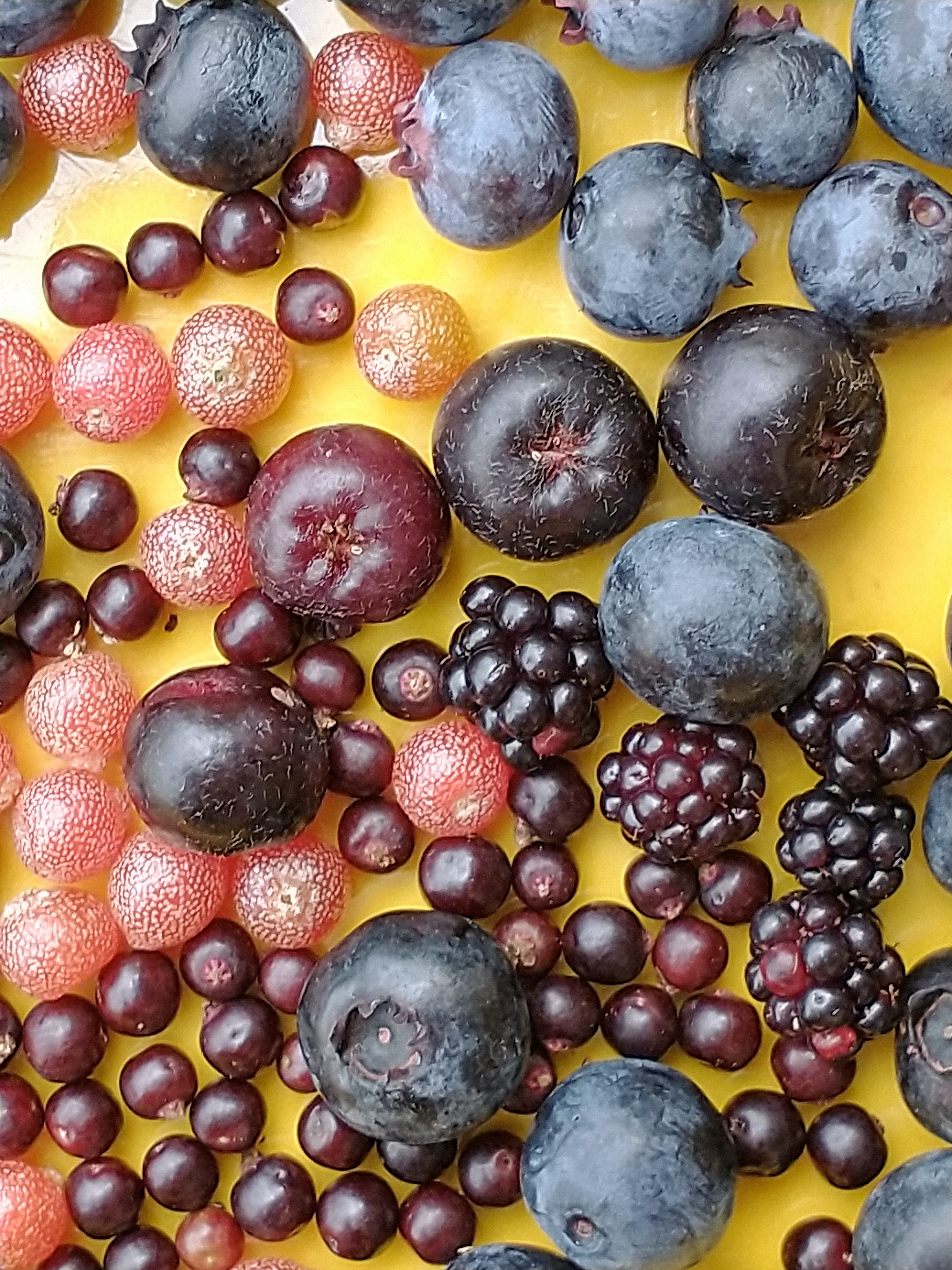 Ripe Aronia is bloody red inside, flavorful, mildly sweet, also juicy if the season is wet. Pictured below with Blueberry, Autumnberry, Elderberry, and unusually small Blackberries.