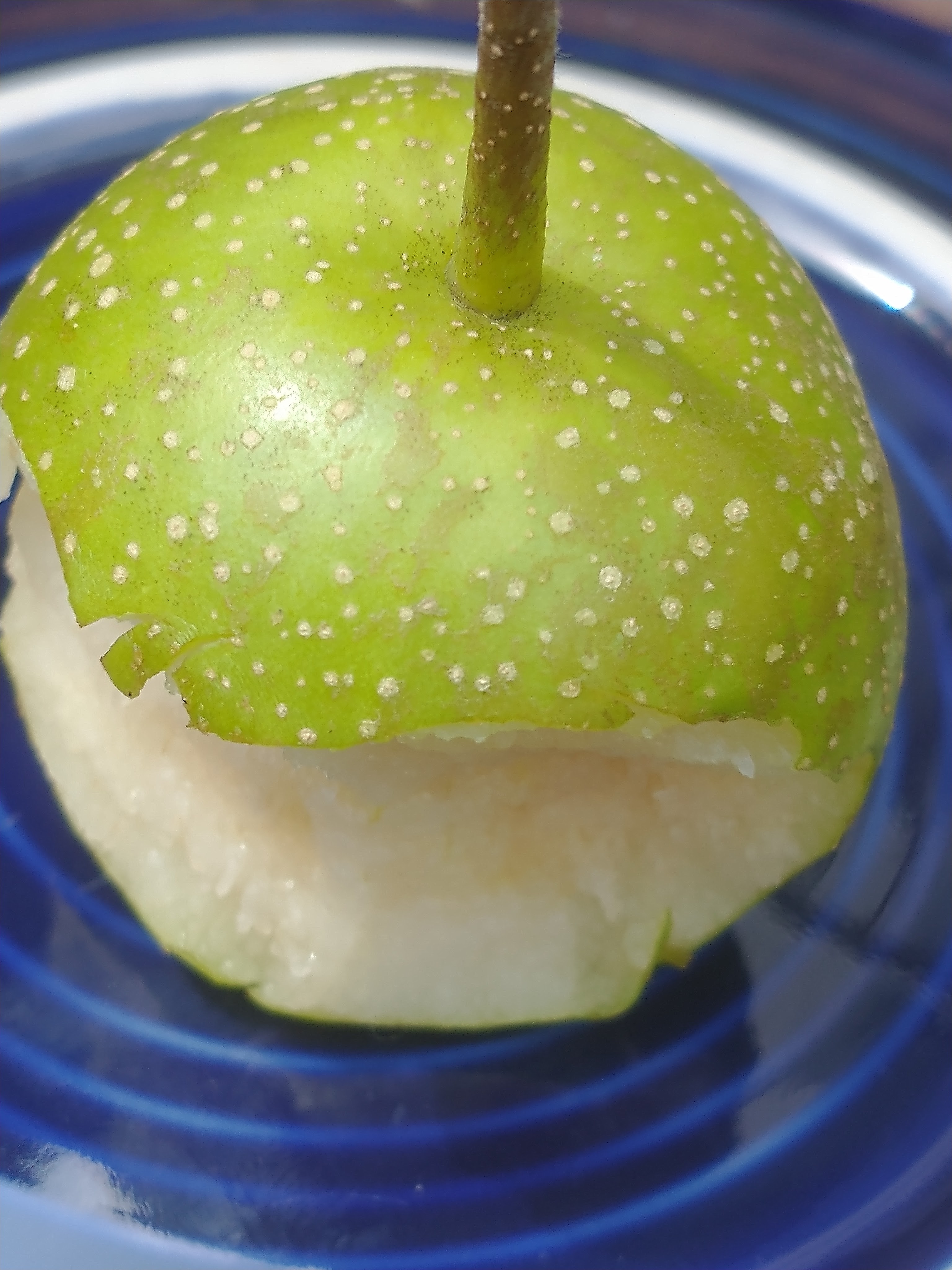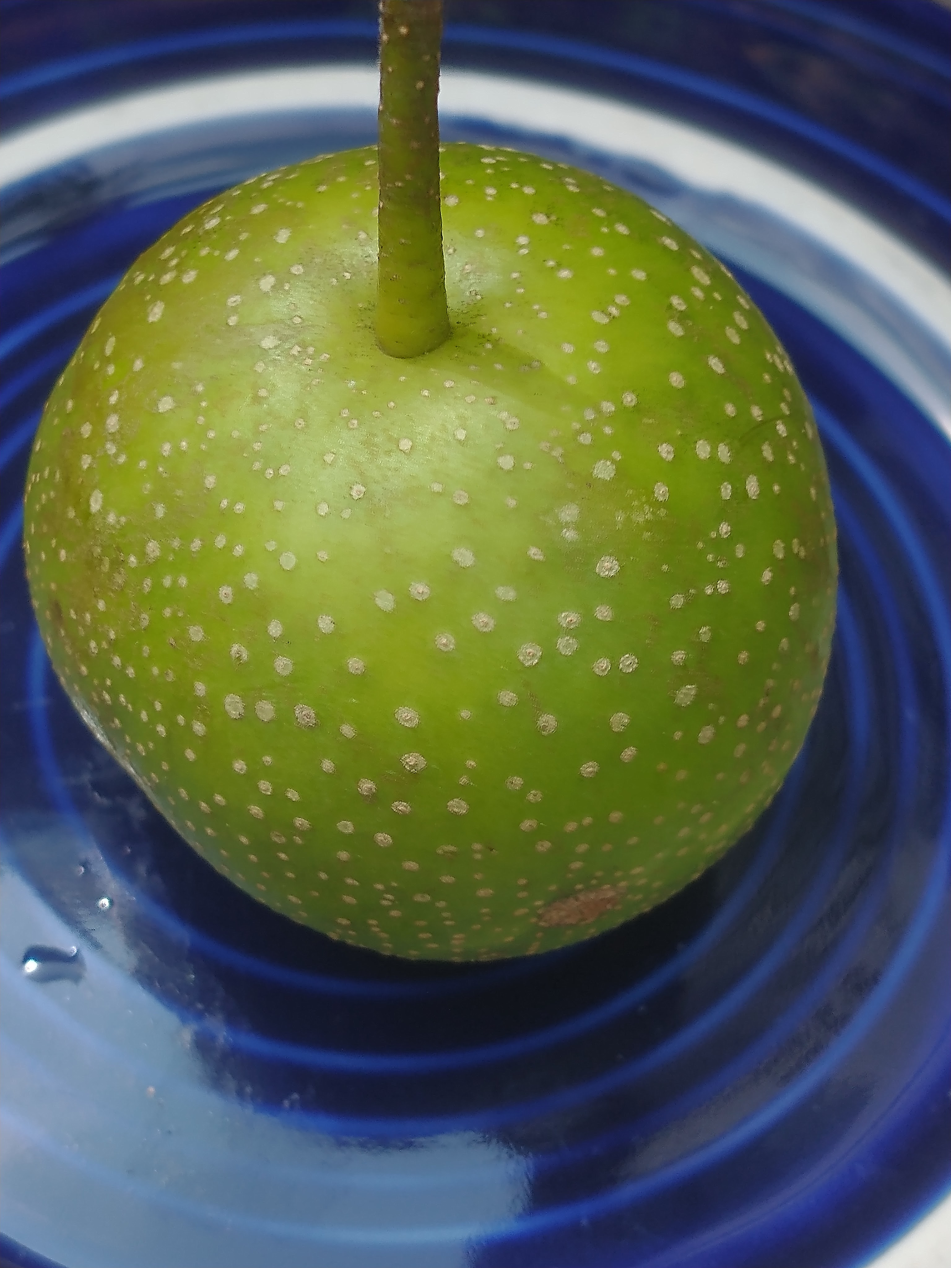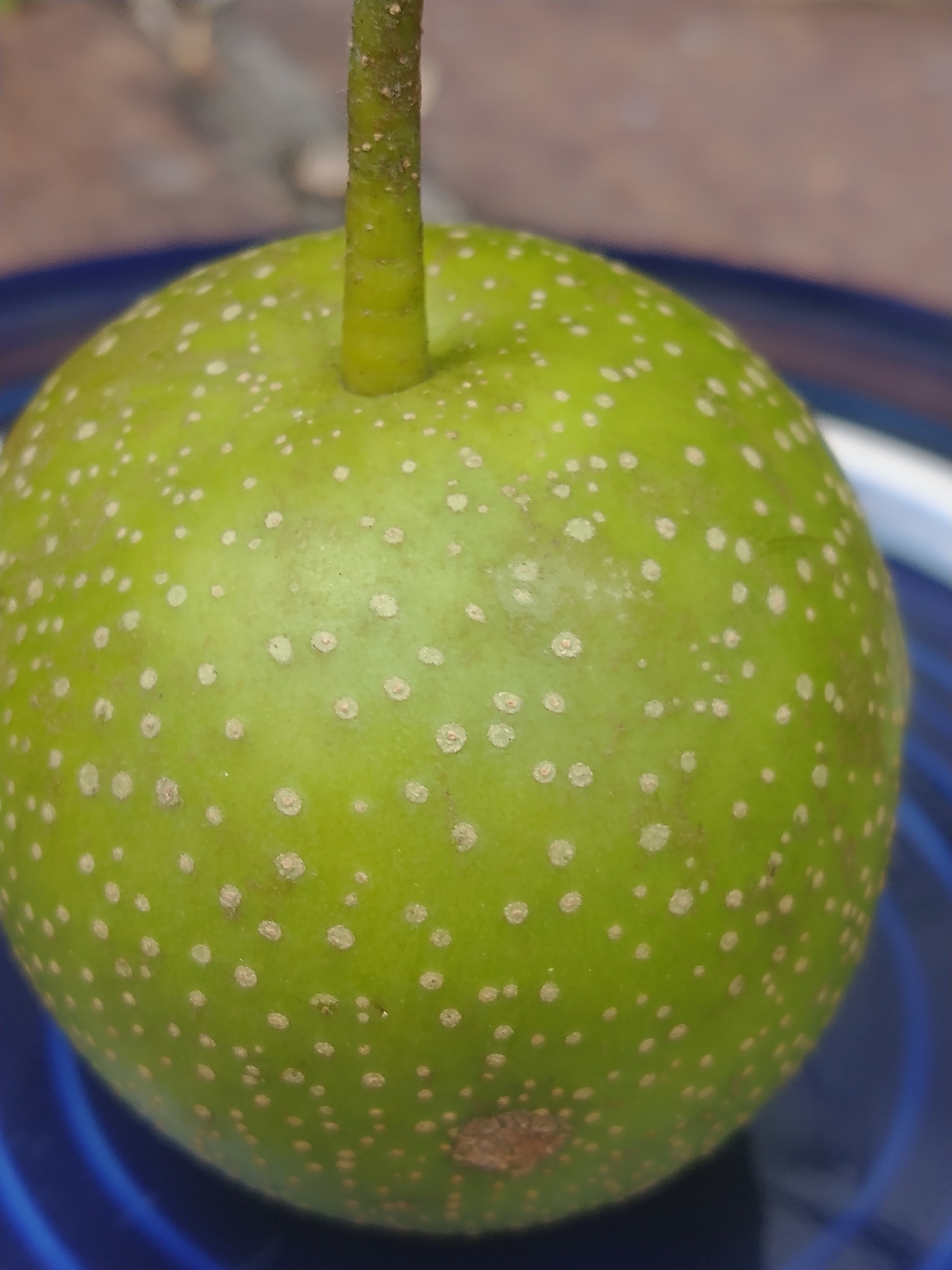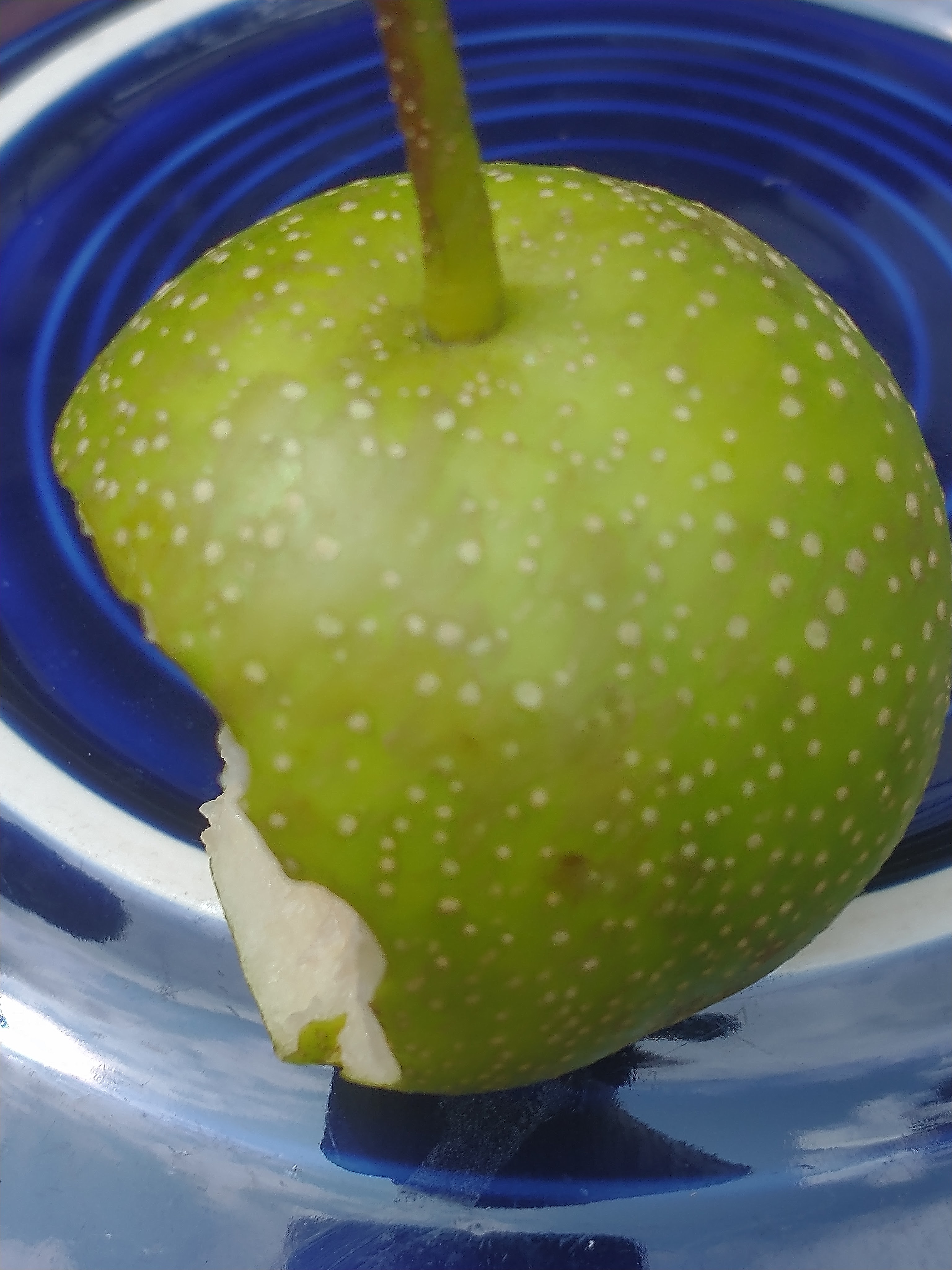Nijisseiki Asian pear (aka 20th Century pear) tastes much like a small mild apple when picked before its typical full ripe sweeter flavor. A great fruit, reliable, precocious, earlier than apples typically. Asian pears are also called apple pears. When fully ripe they can have an almost piercing sweetness, though sometimes a very simple almost bland sweet. Variety selection will affect flavor somewhat. Deer love to eat the fruit at this less than fully ripe stage if they can reach it when on the tree. Less ripe, less sweet, yet with arguably more flavor than full ripe.