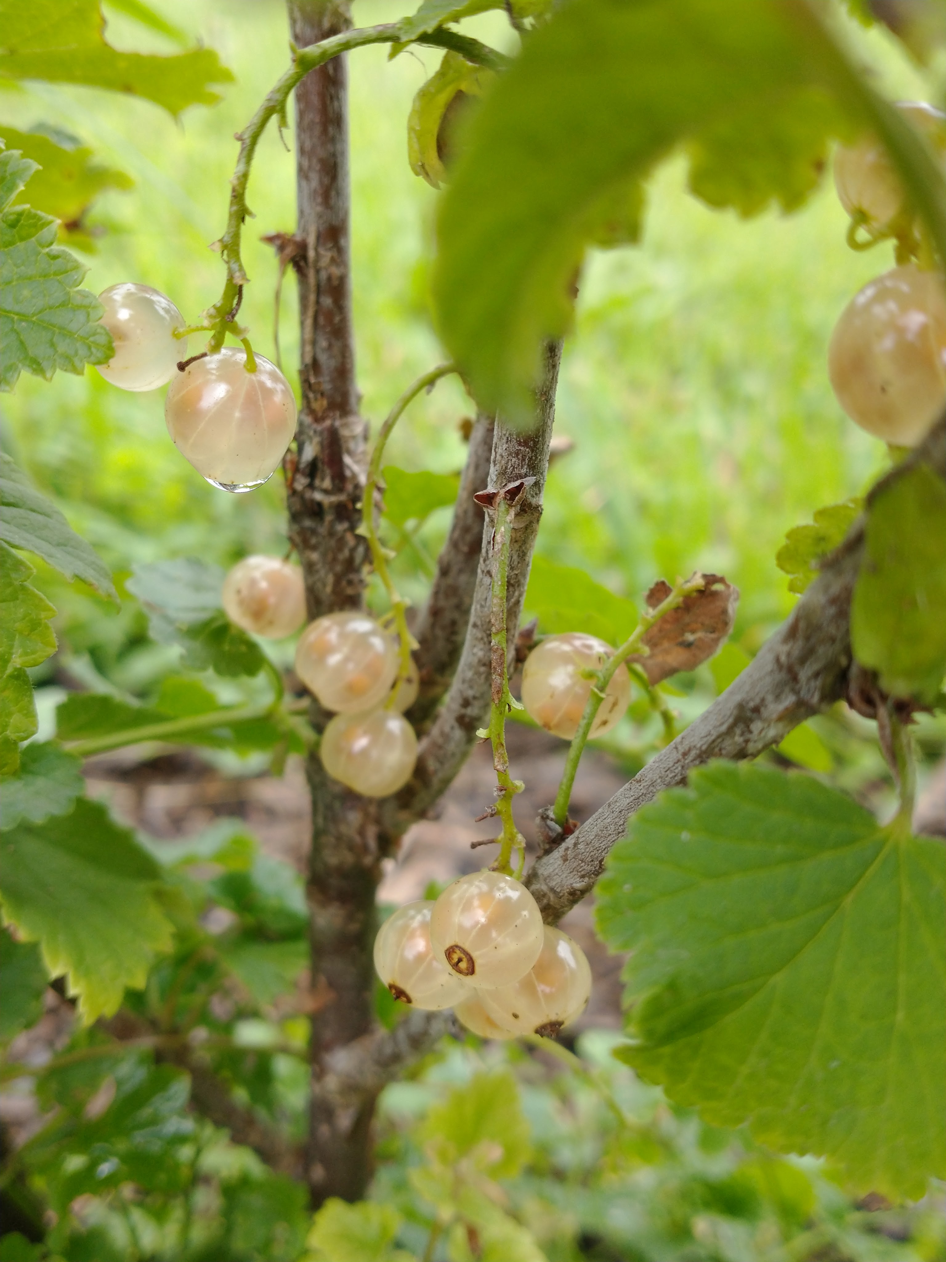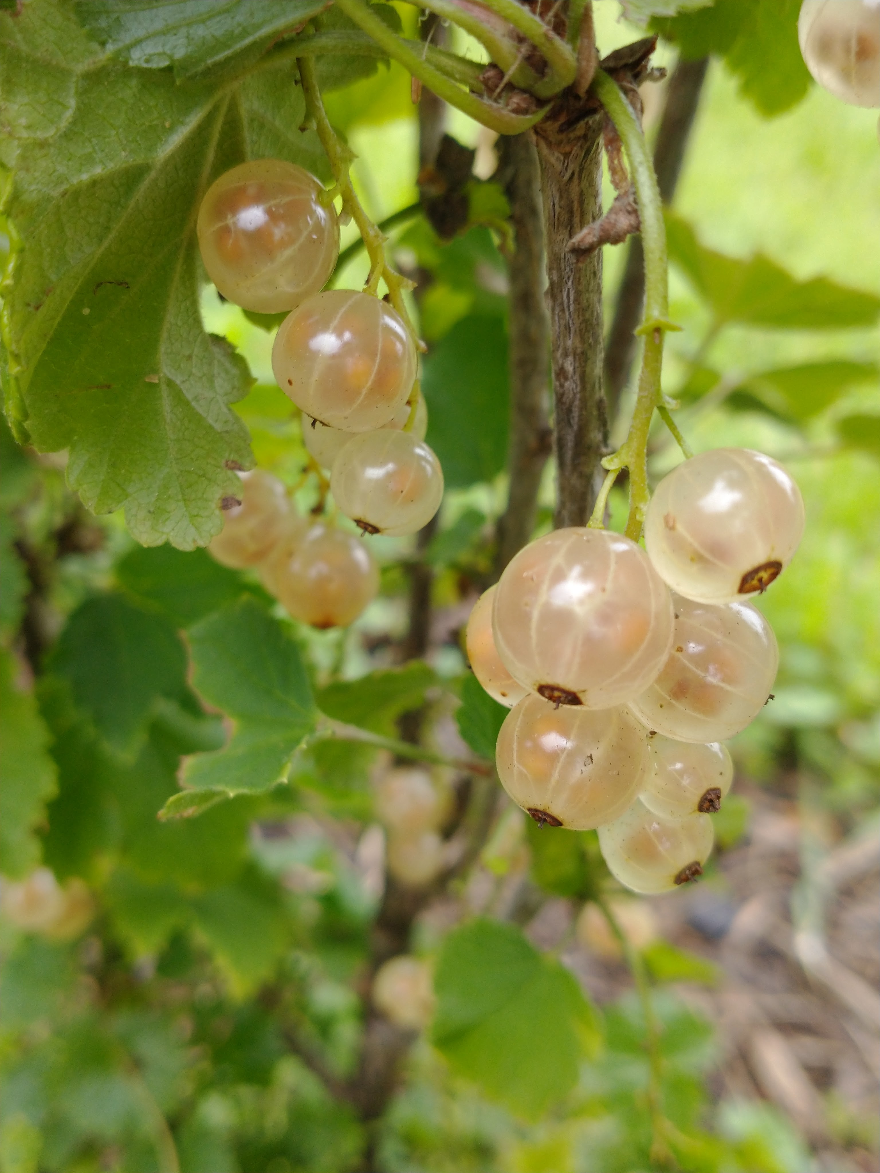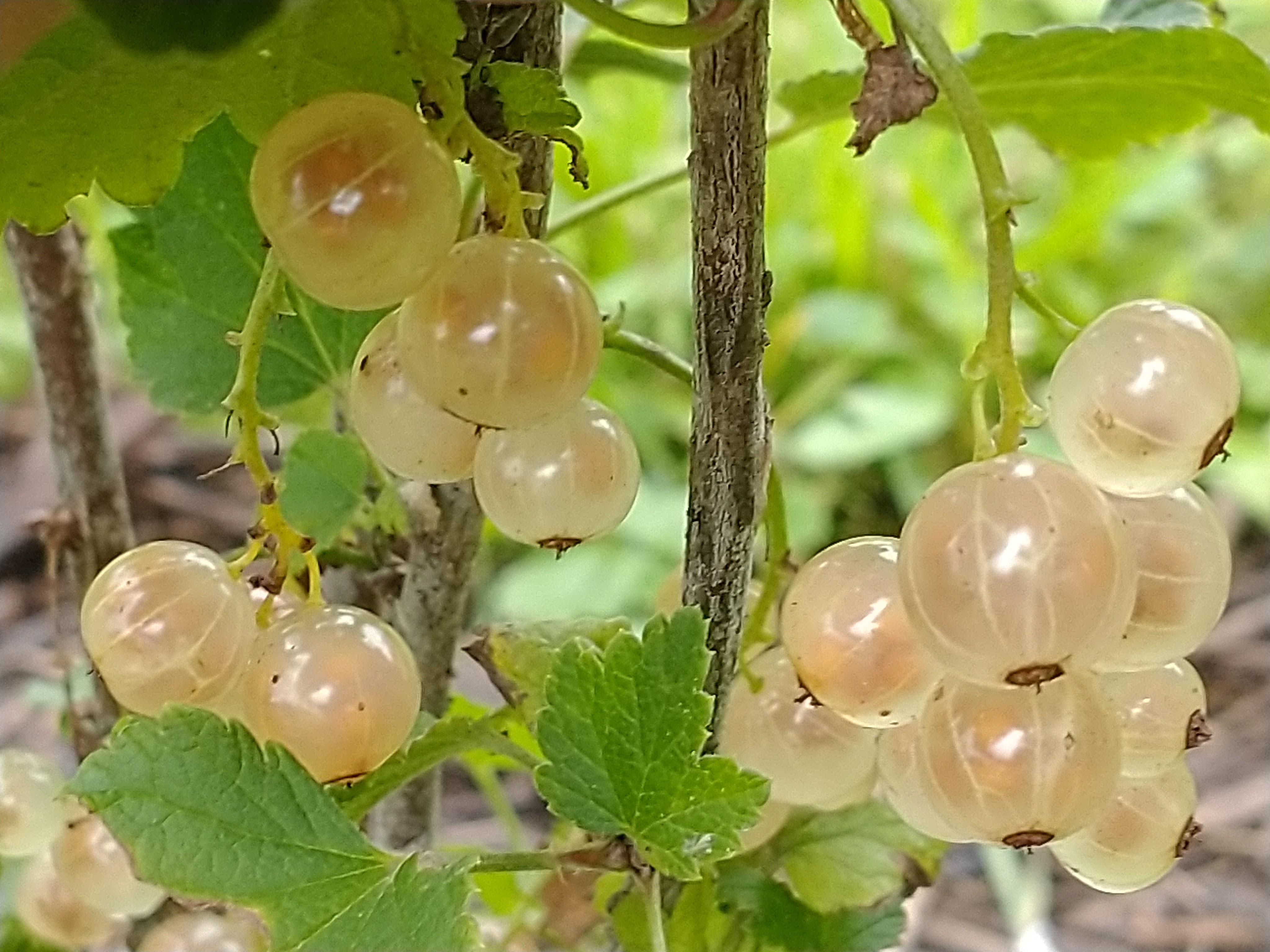 White currants when full ripe are sweet with little or no tart flavor. The sweetest of all the currants. Great hang time with currant fruit. These fully ripe sweet currants are some of the same fruits photoed exactly a month prior – here – when they were also very edible though somewhat tart. Currant fruit can continue to hang without spoiling when full ripe, somewhat depending on weather and growing conditions. Songs birds and wild turkeys left these white currants alone, this year at least, and went after the gooseberries instead, even though unlike currants, gooseberries have thorns to protect their fruit a bit, typically though only if the limbs grow tangled enough to give extra shelter to the berries.