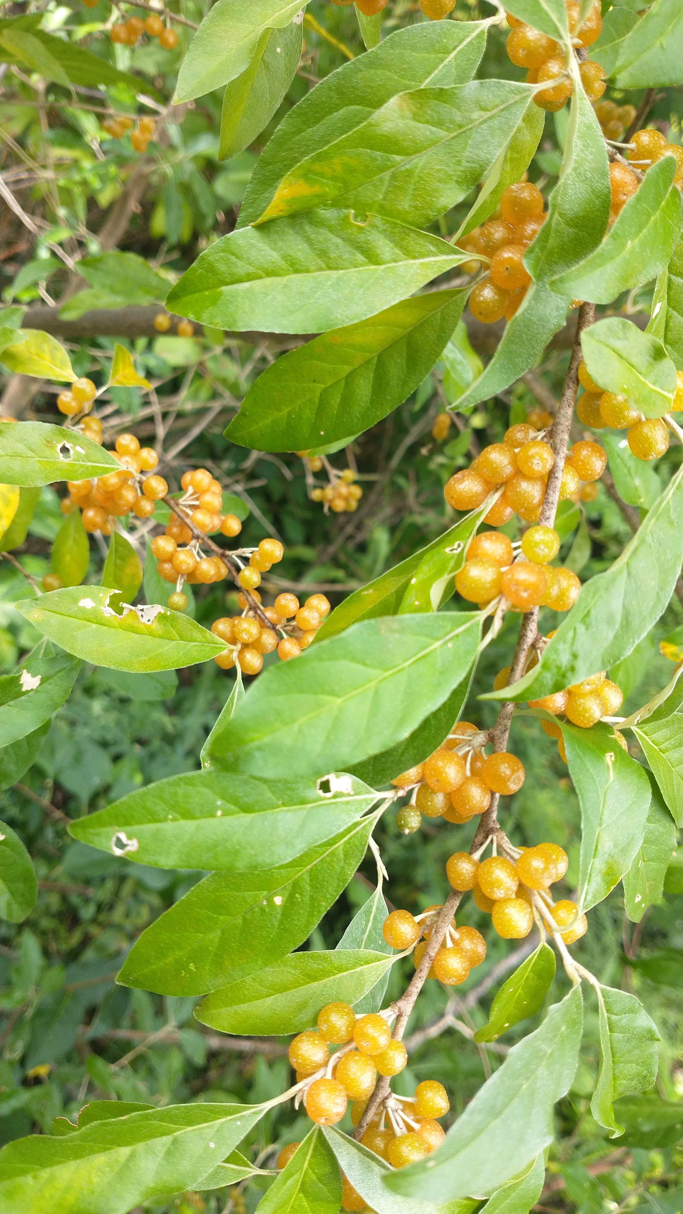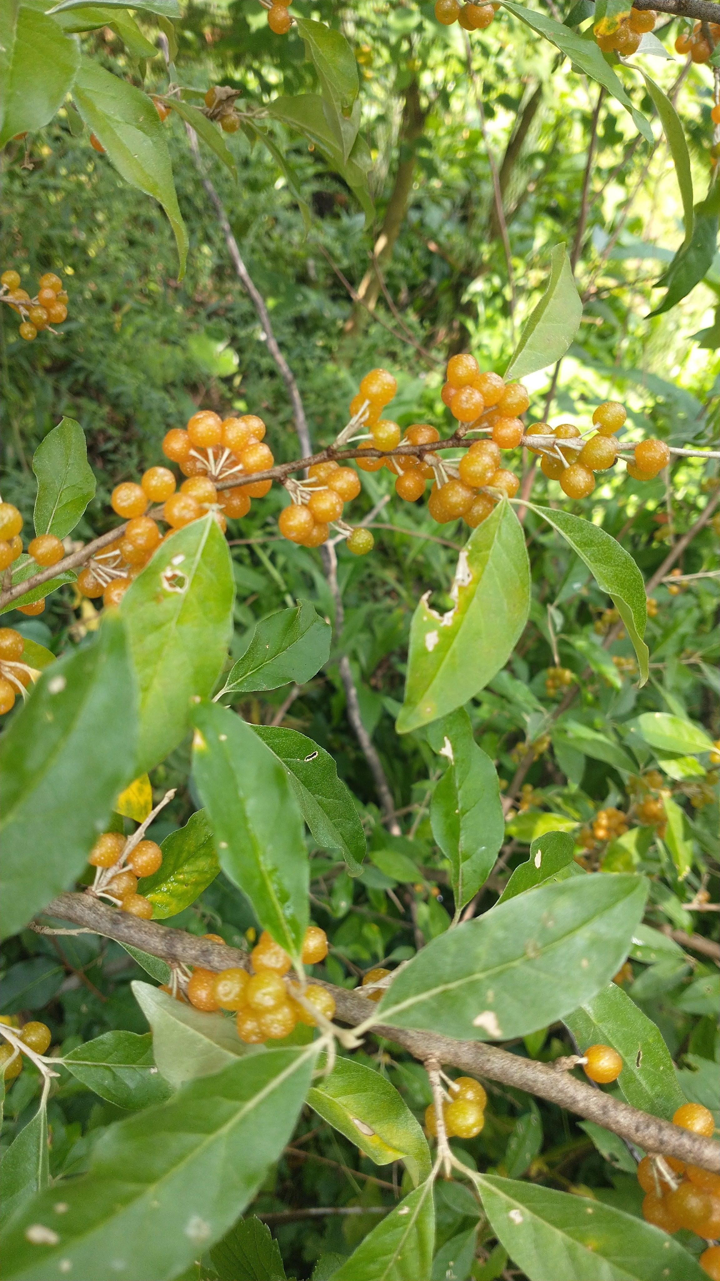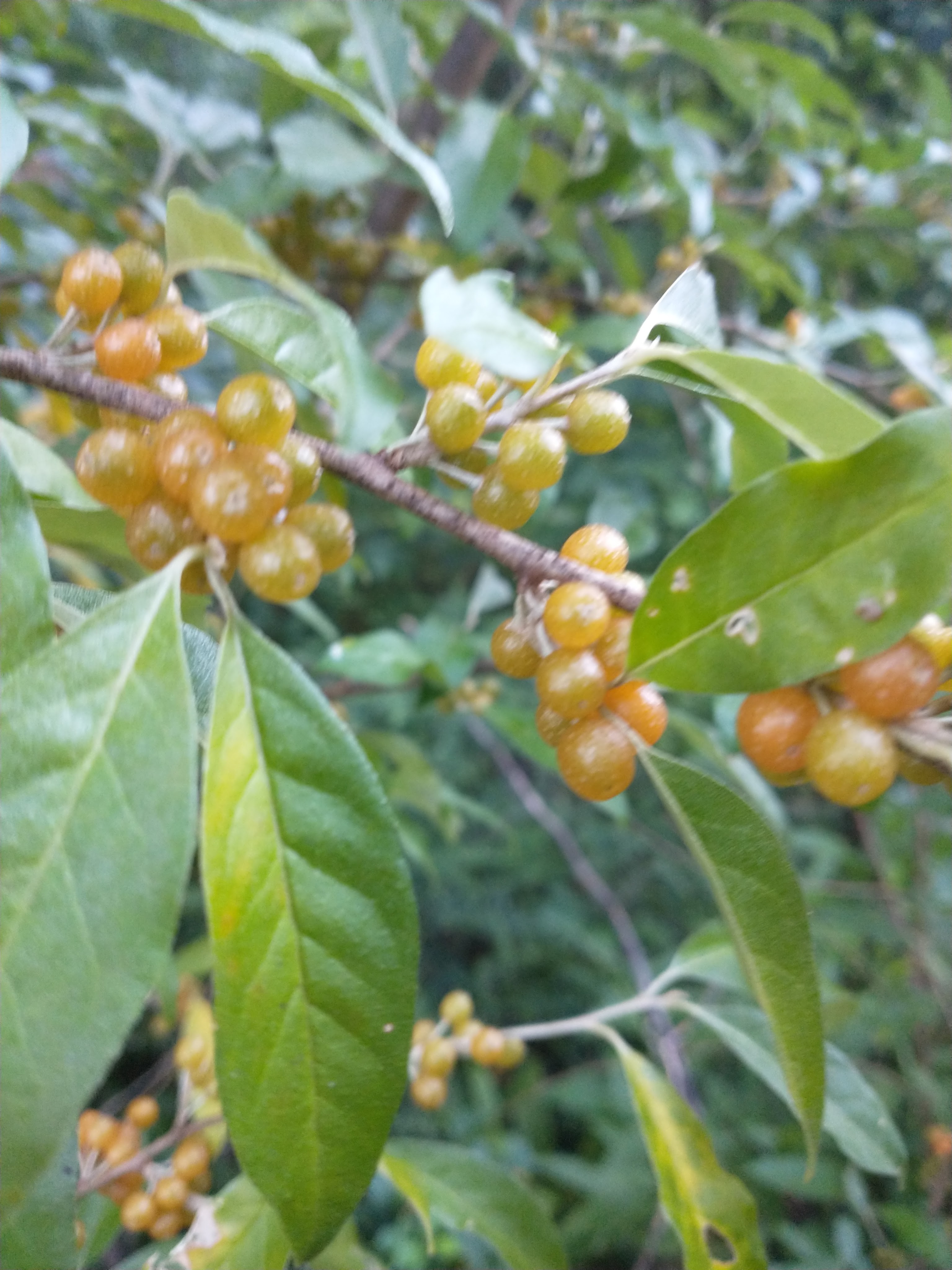 Amber Autumnberry (Autumn Olive). There are multiple varieties of amber Autumnberry. One has larger fruit than all other Autumnberry that I’ve come across, red or amber. It’s also sweeter, if not quite as flavorful as the red varieties. Another variety of amber Autumnberry is more prolific than the large fruit variety but with smaller and less sweet fruit. While a number of states list Autumn Olive as invasive, it’s a reliable and prolific berry to have one hand in late summer and fall when many other berries are finished. The very fibrous if nutritious kernels can be spit or swallowed.