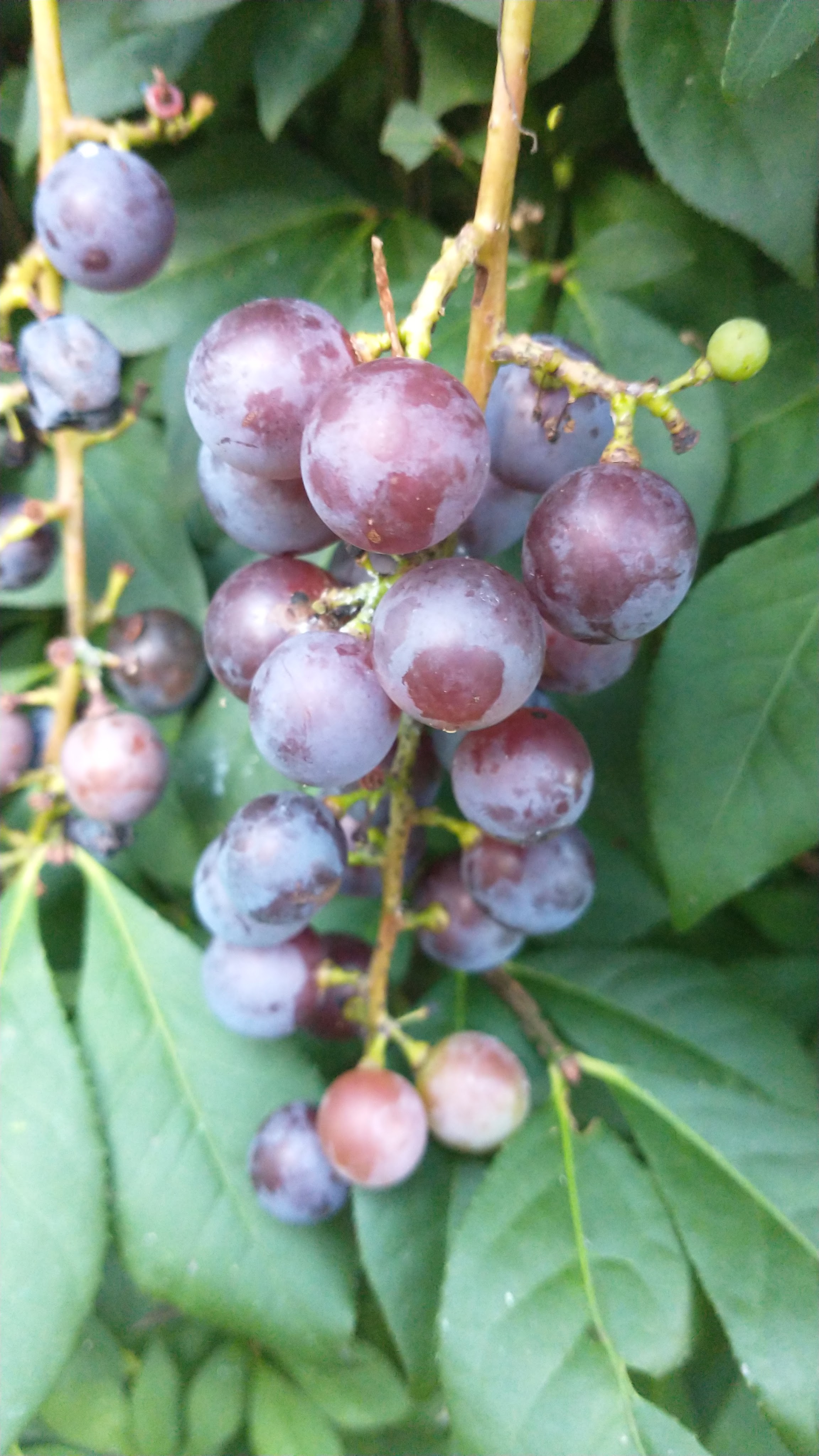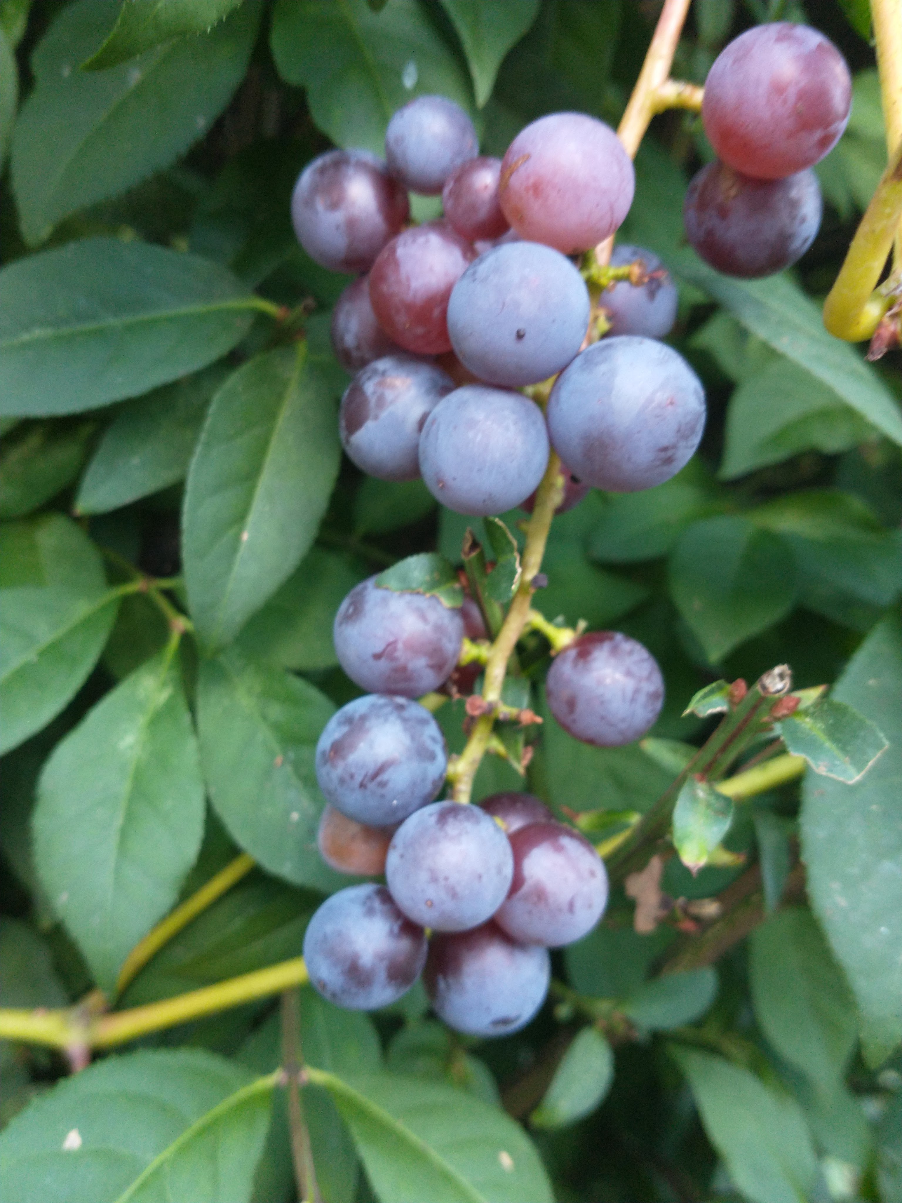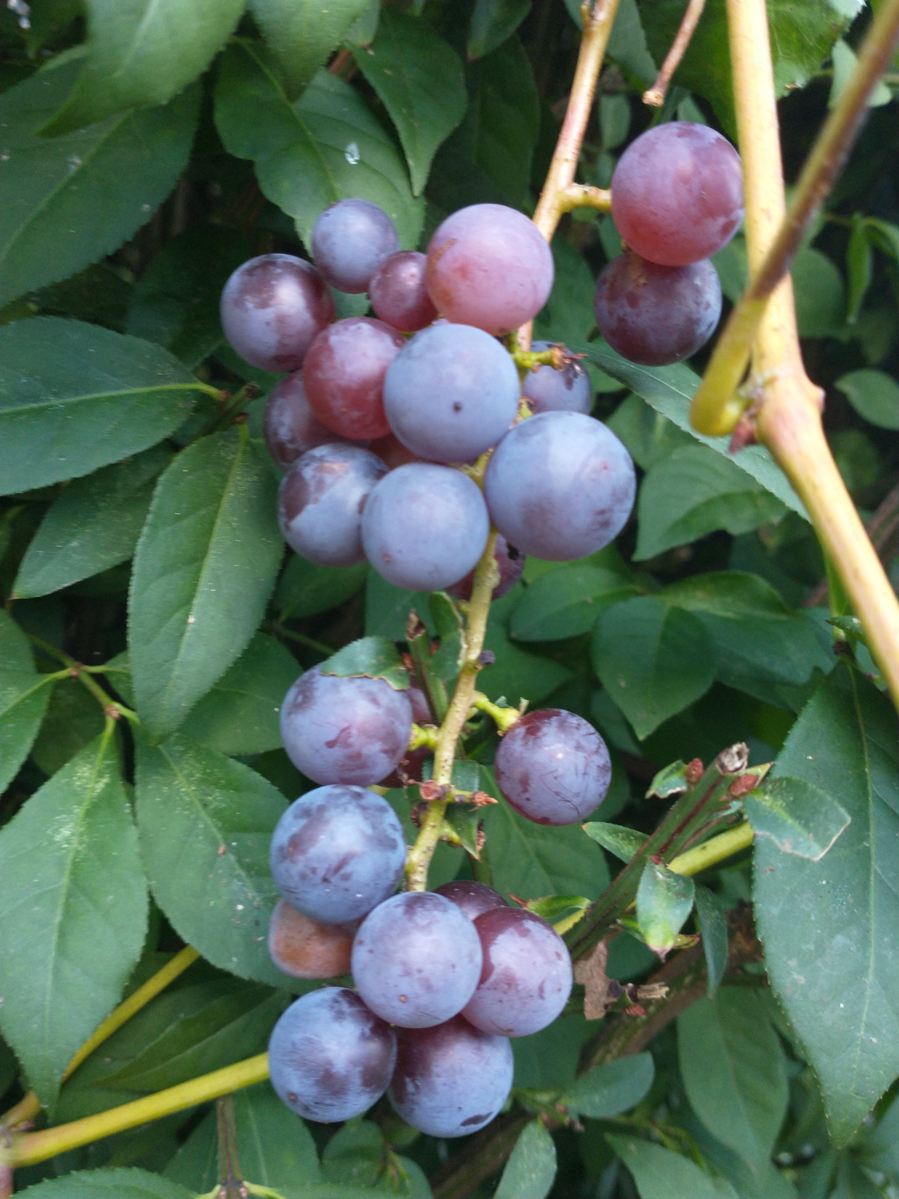 Canadice grapes, ripe for a couple weeks now, zone 6b northern West Virginia. A few seeds, tart skin, very sweet thick pulp. This vine grows on a bush, gets direct sun until about 3:30 p.m. These grapes are untreated. Black rot took a percentage. Some of the casualties can be seen as black, shriveled, raisin-like mummies. Other infected grapes dropped or were plucked off in the preceding weeks.
