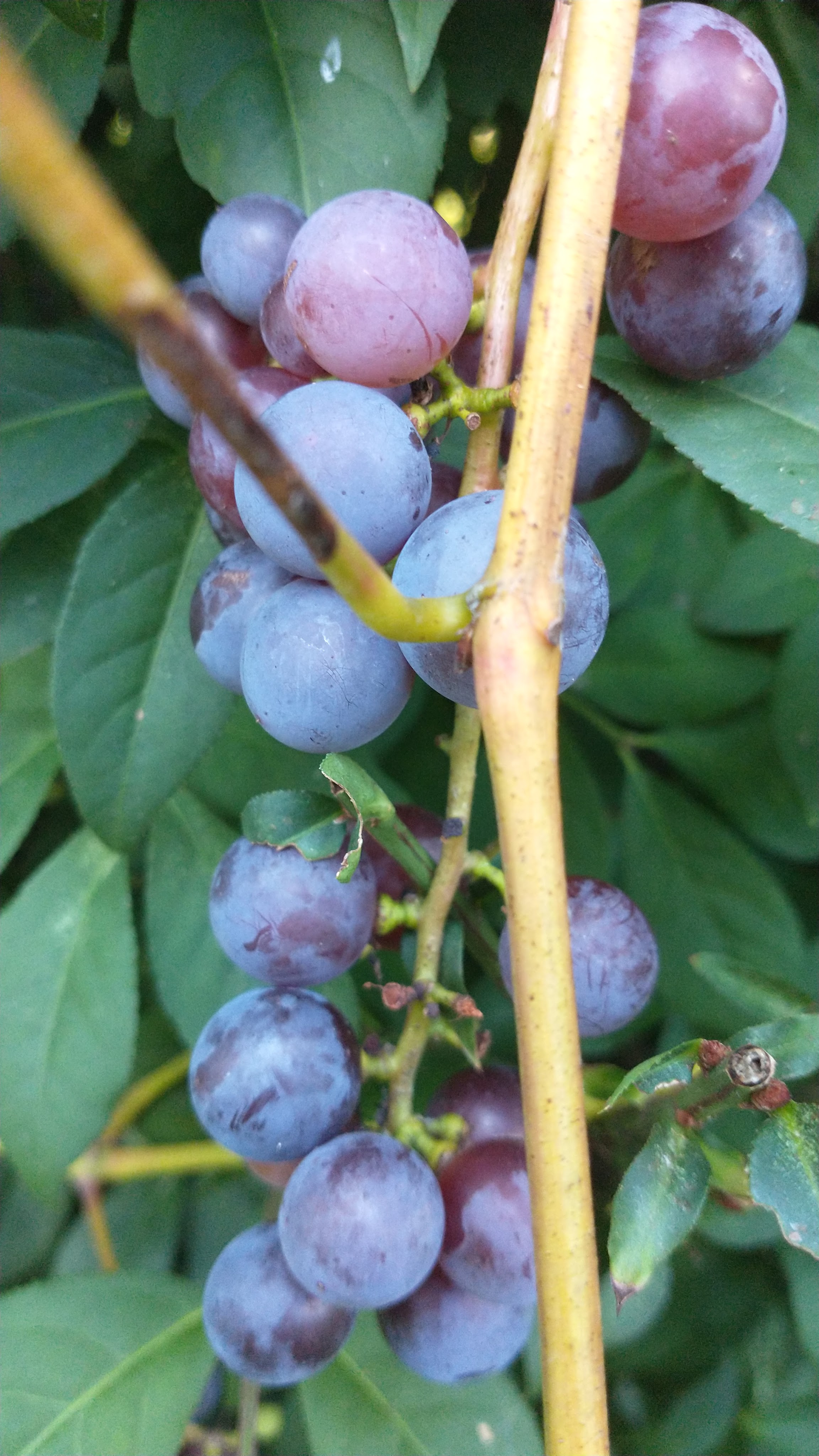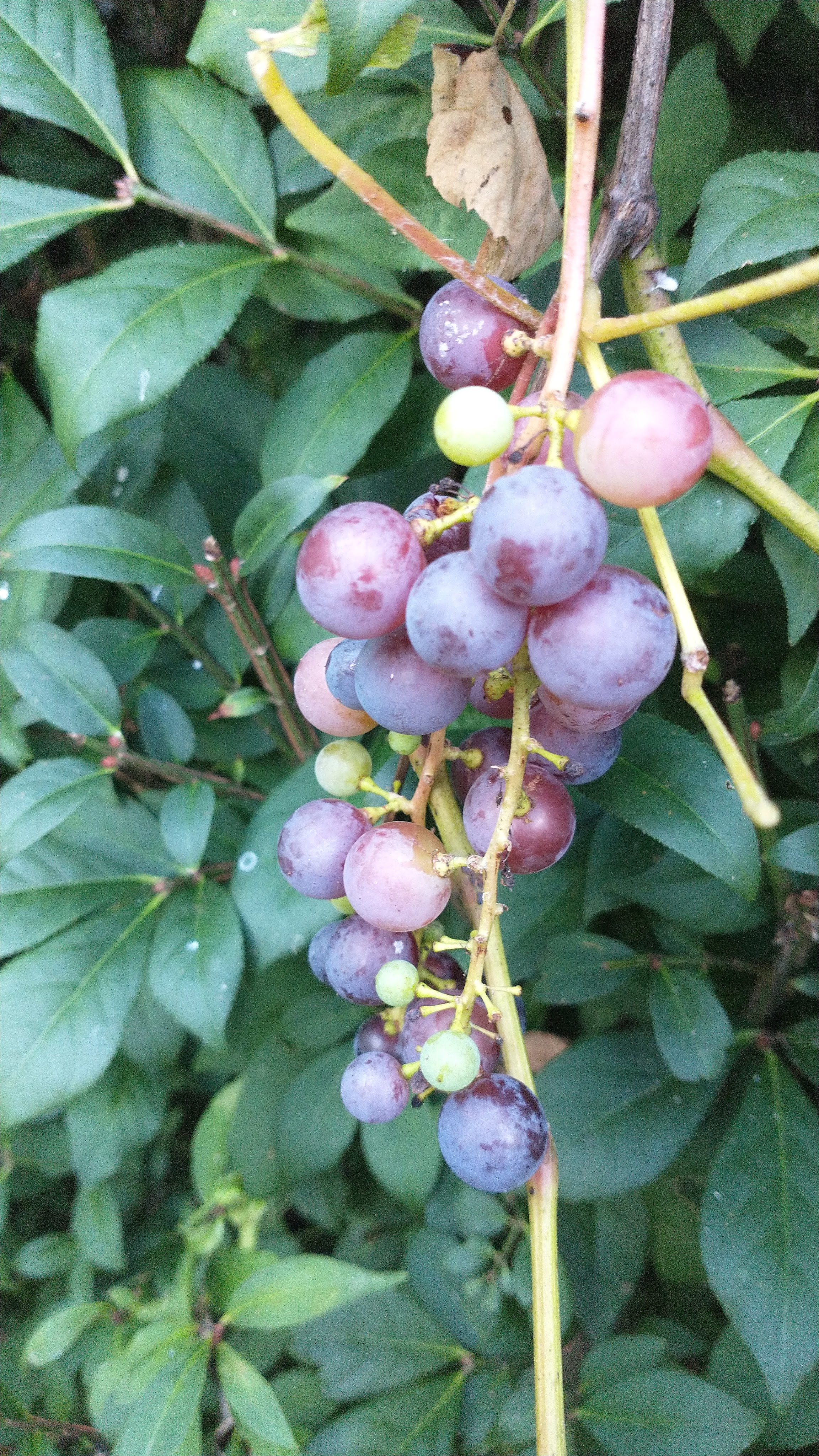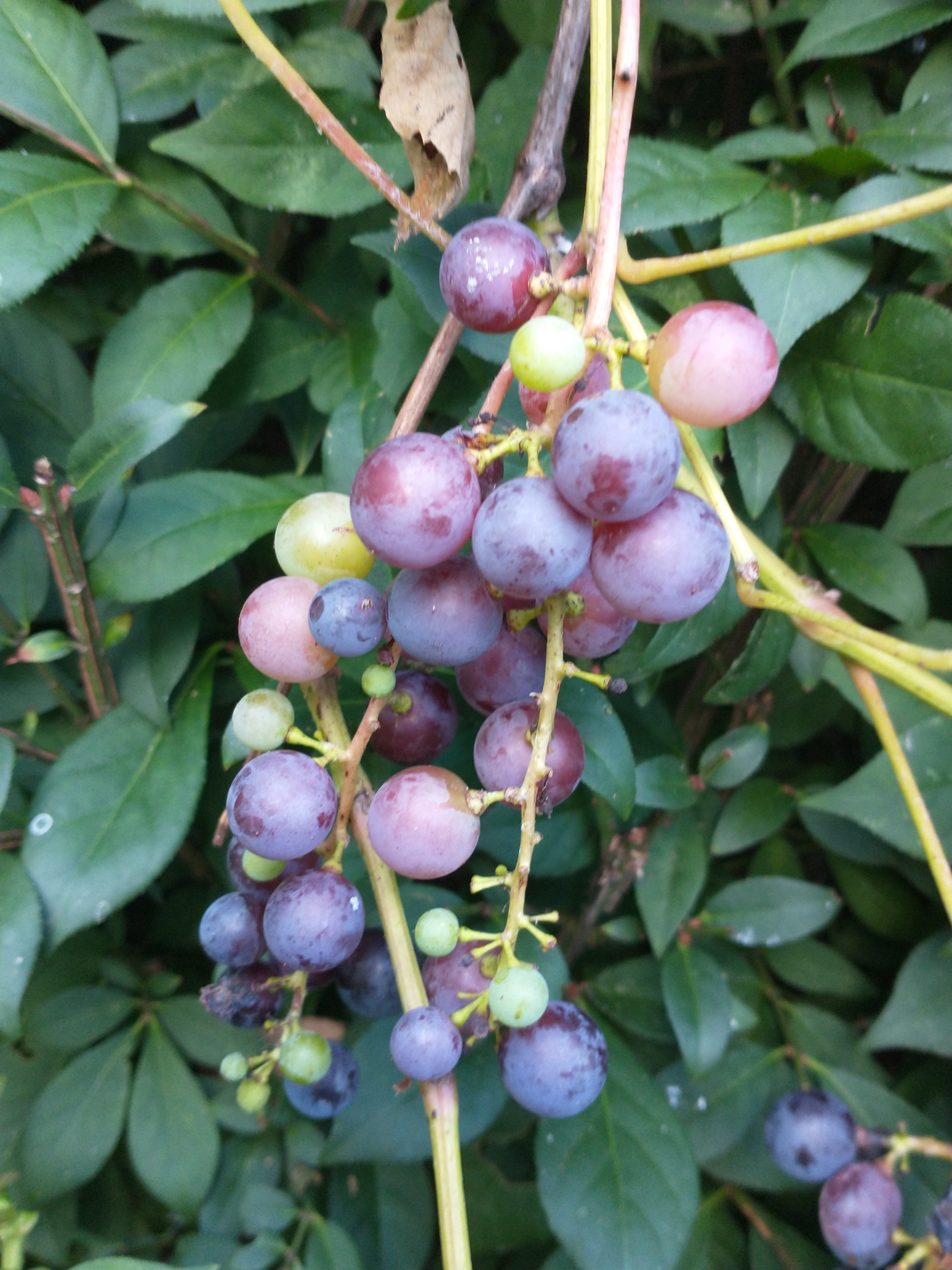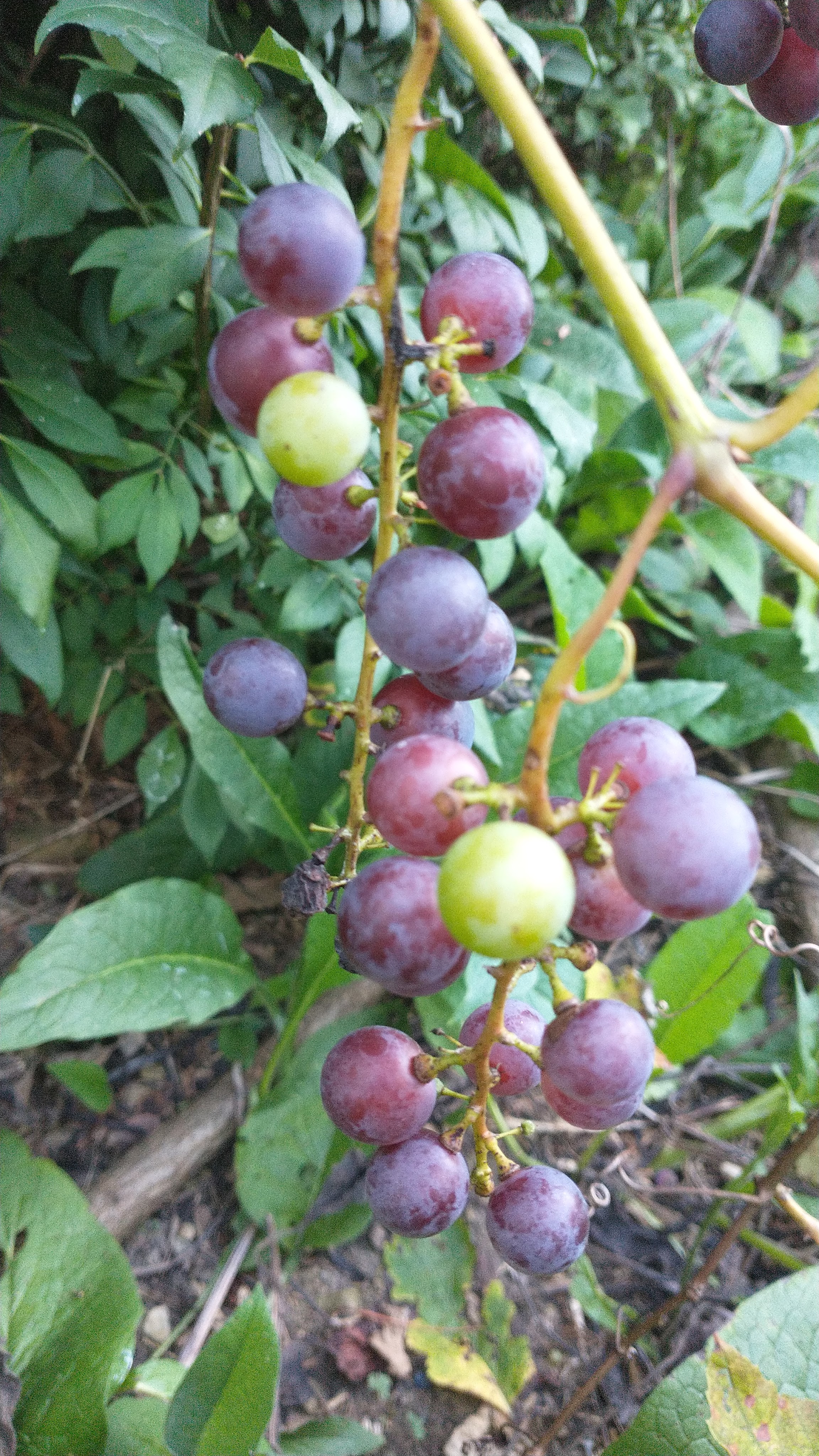 Canadice grapes, ripe for a couple weeks now, zone 6b northern West Virginia. A few seeds, tart skin, very sweet thick pulp. This vine grows on a bush, gets direct sun until about 3:30 p.m. These grapes are untreated. Black rot took a percentage. Some of the casualties can be seen as black, shriveled, raisin-like mummies. Other infected grapes dropped or were plucked off in the preceding weeks.