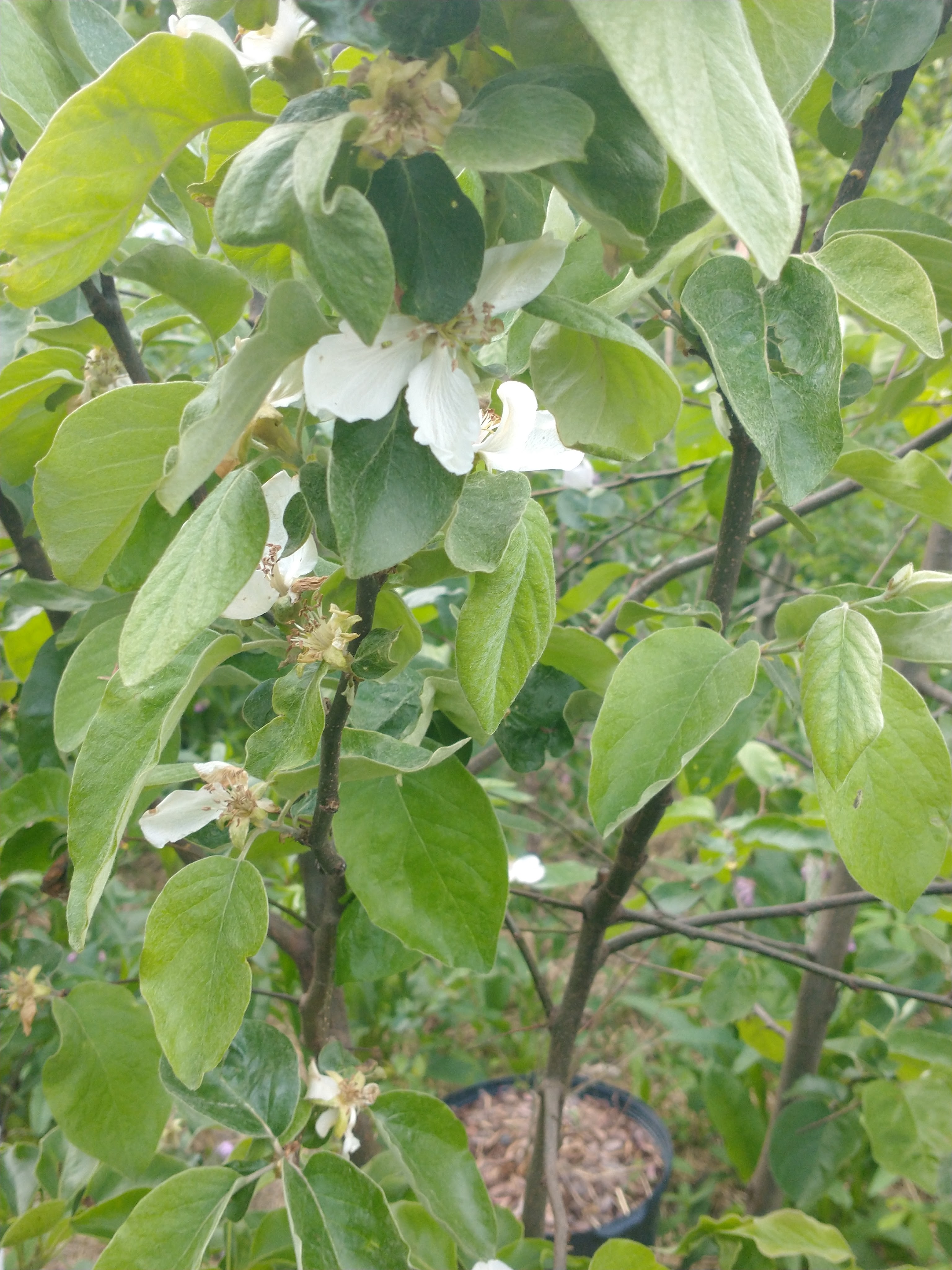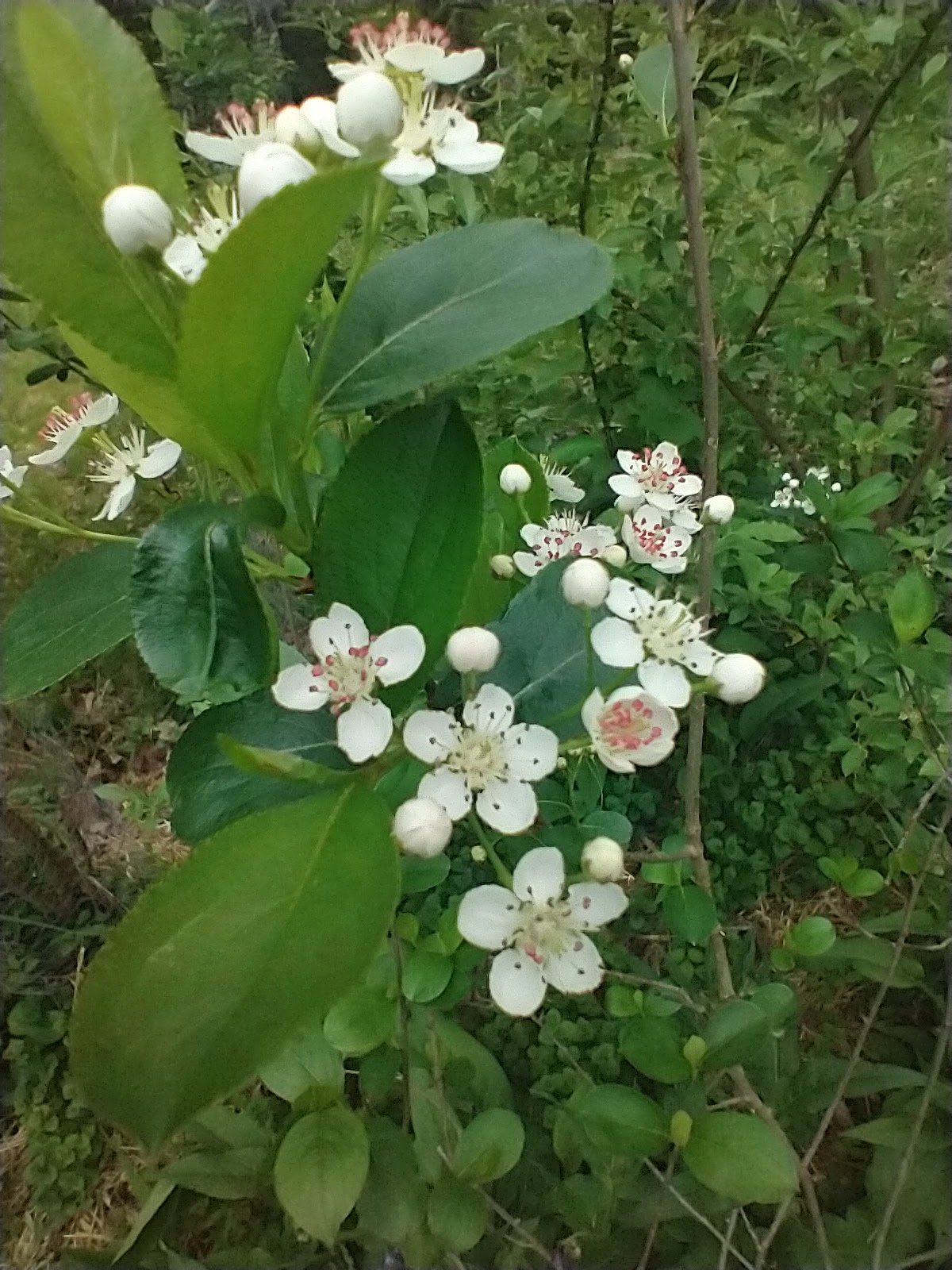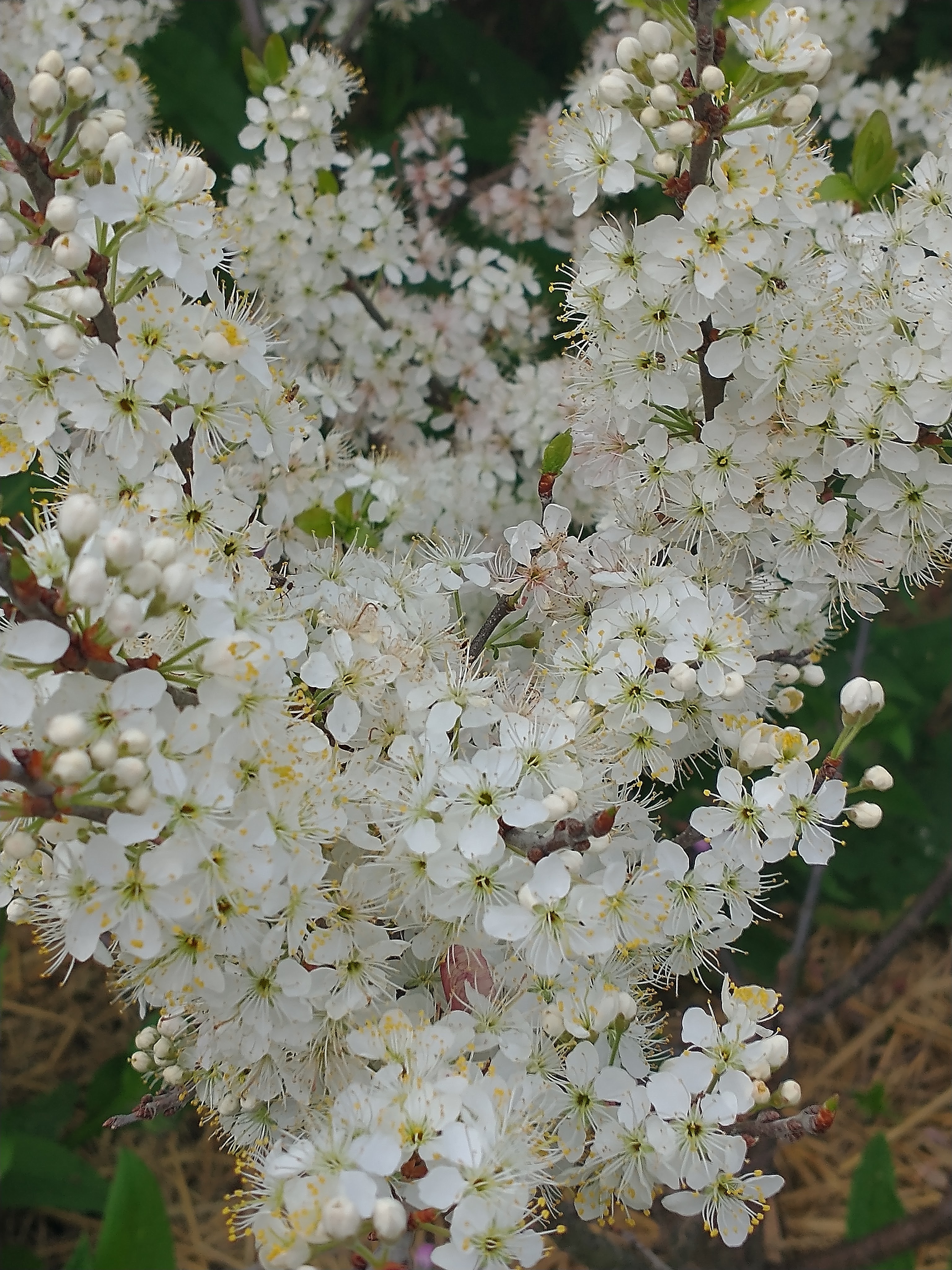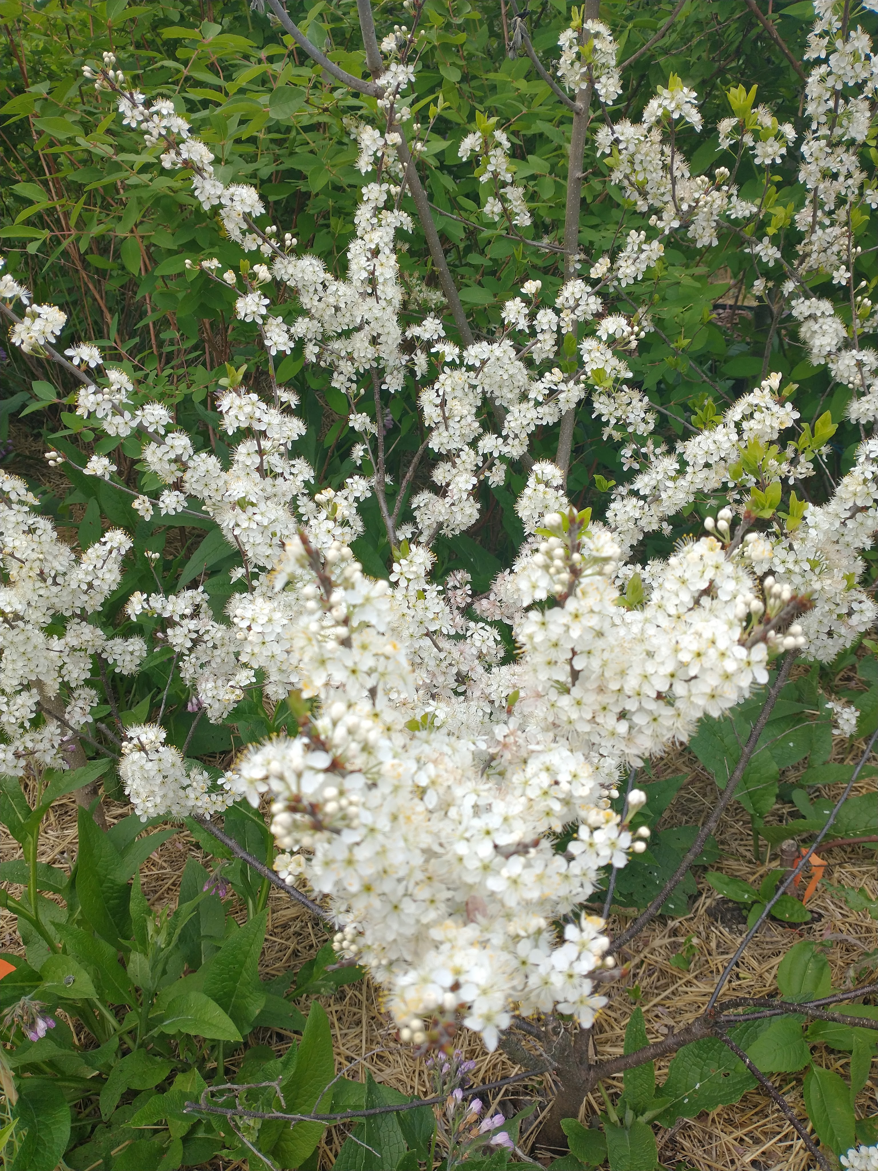Juliet bush cherry, black elderberry with unusually early blossoms coming, large-size goumi pushing its blossoms off its fruit, medlar preparing to bloom, also blackberry: