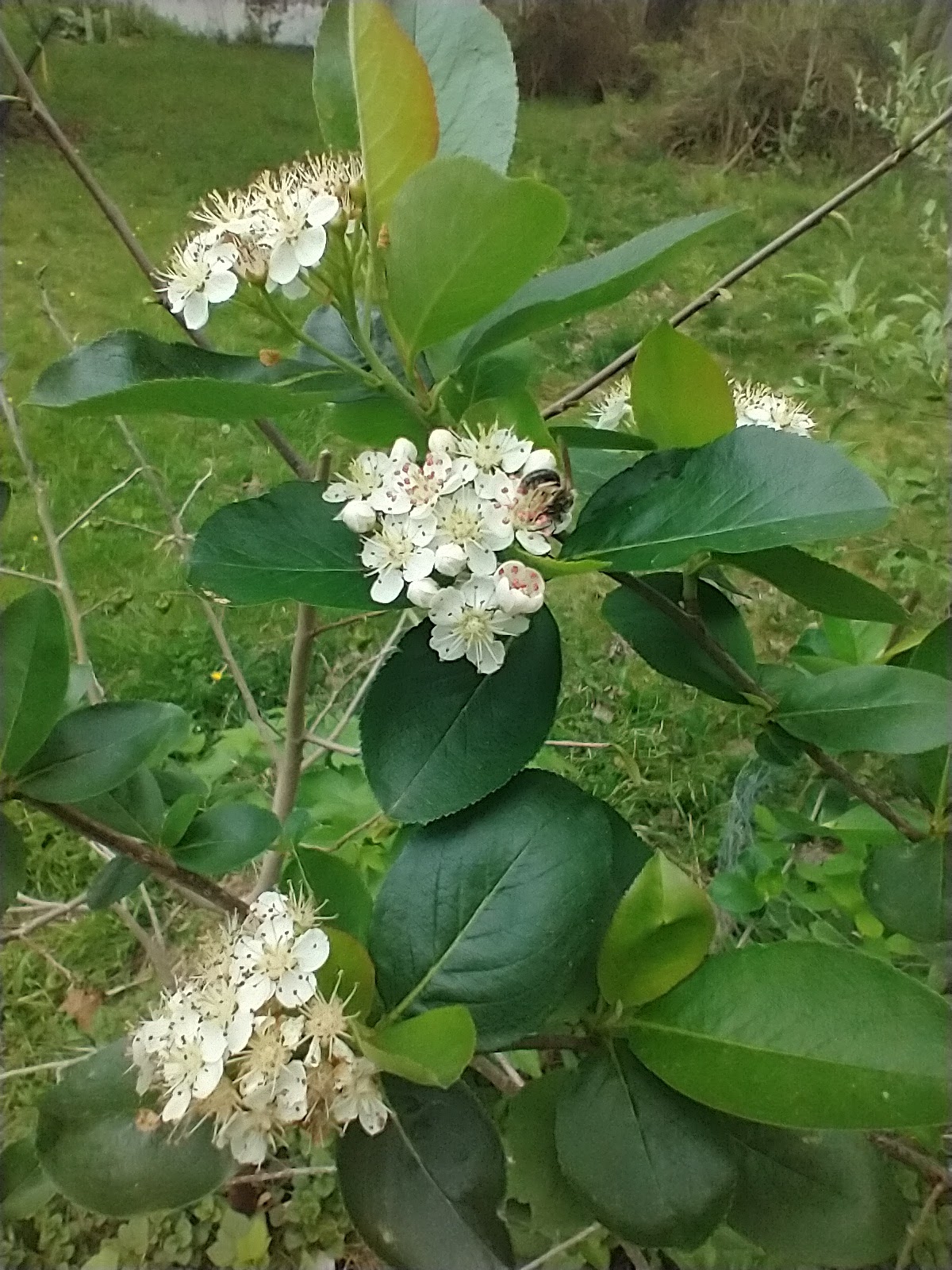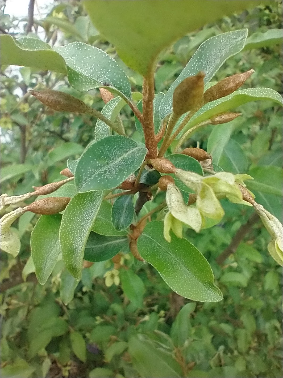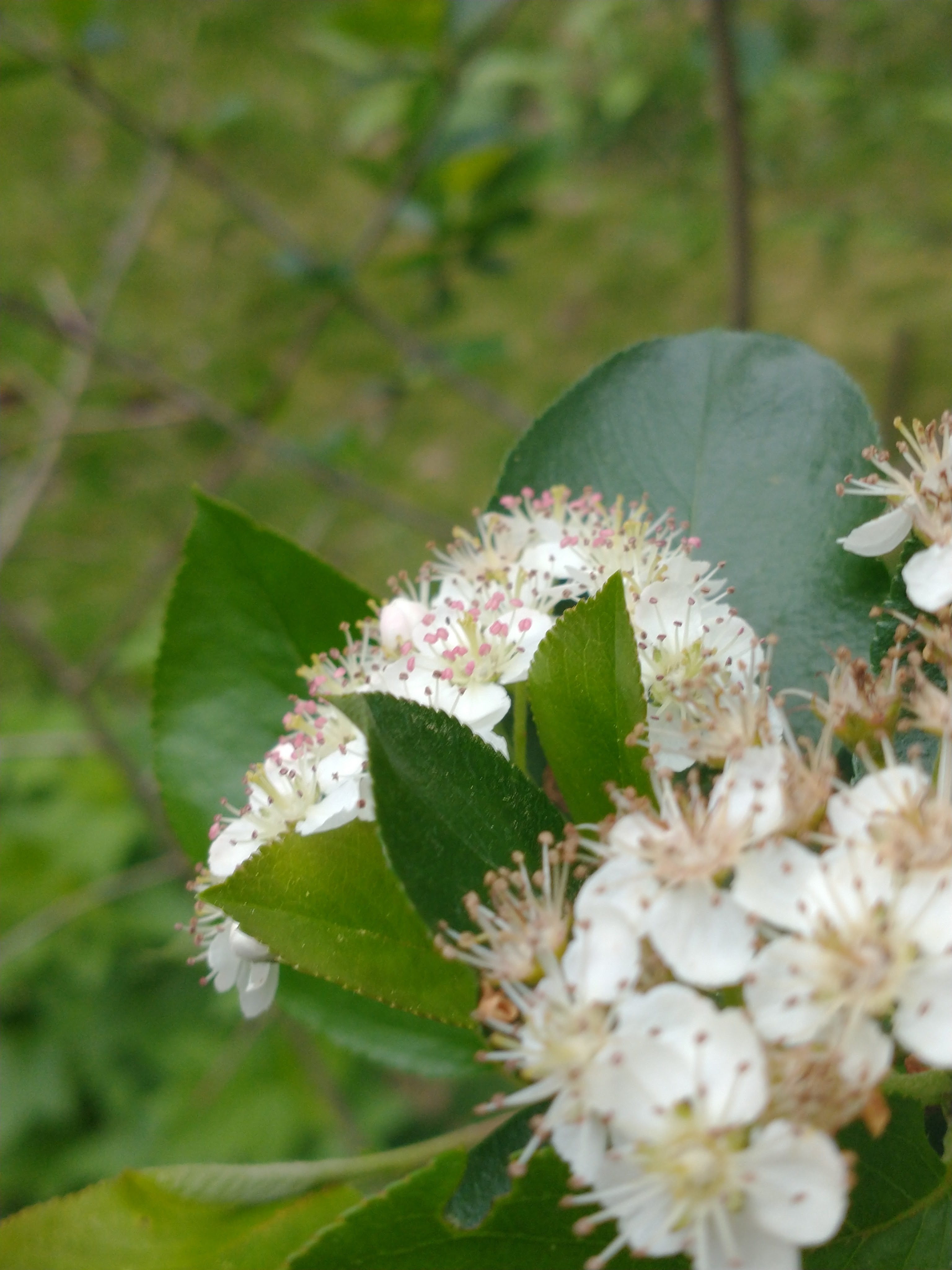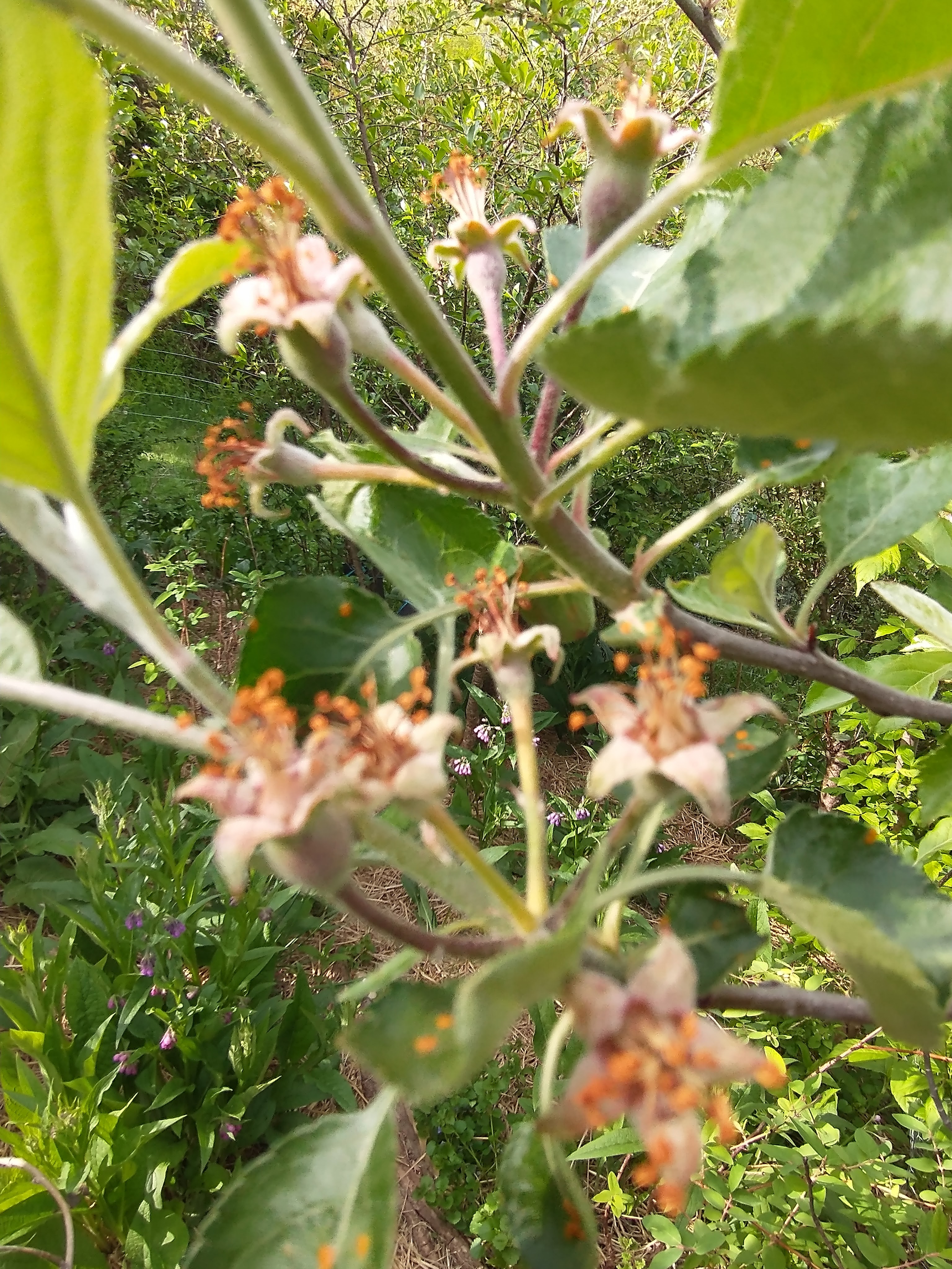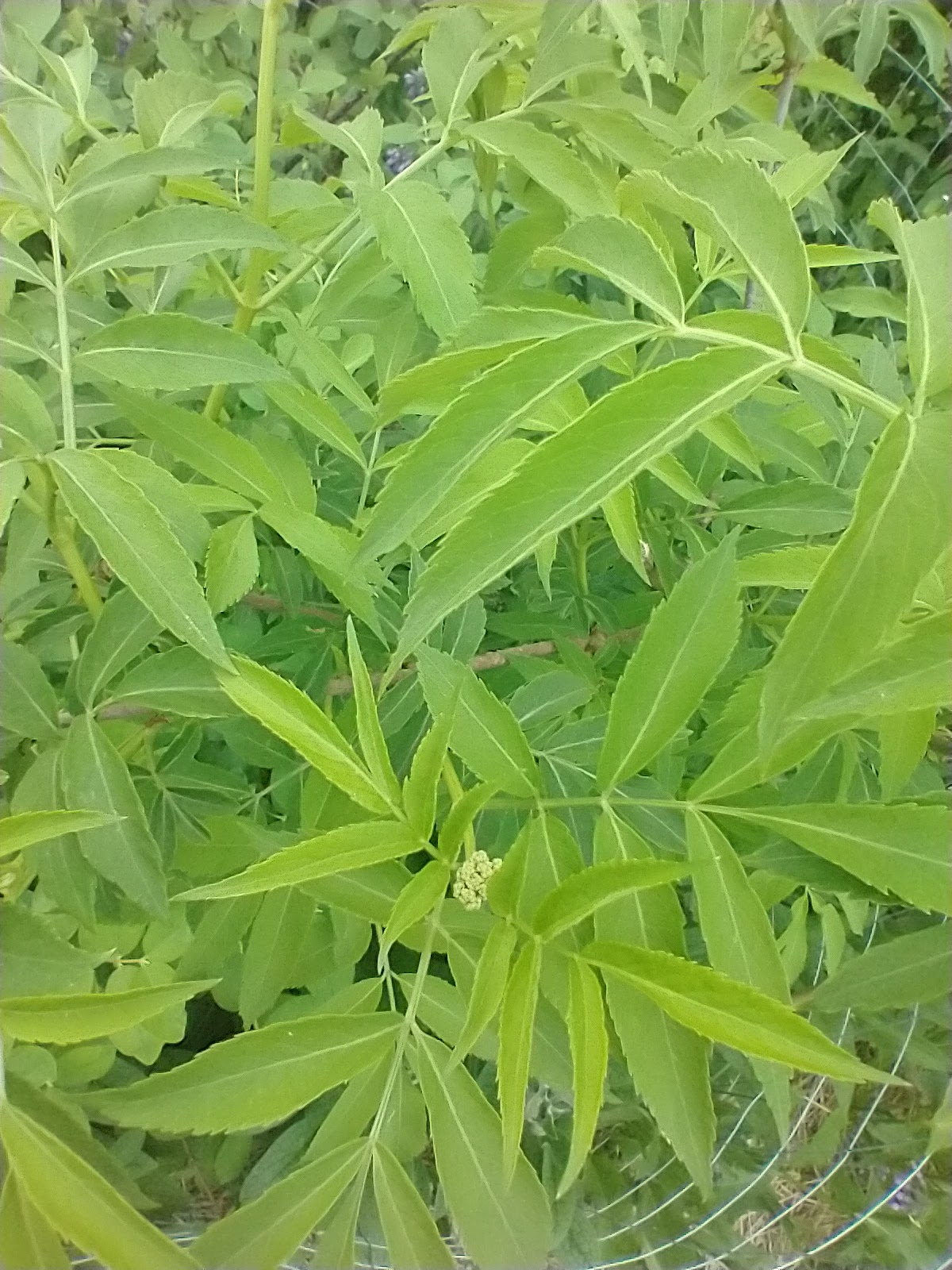 Juliet bush cherry, black elderberry with unusually early blossoms coming, large-size goumi pushing its blossoms off its fruit, medlar preparing to bloom, also blackberry:
