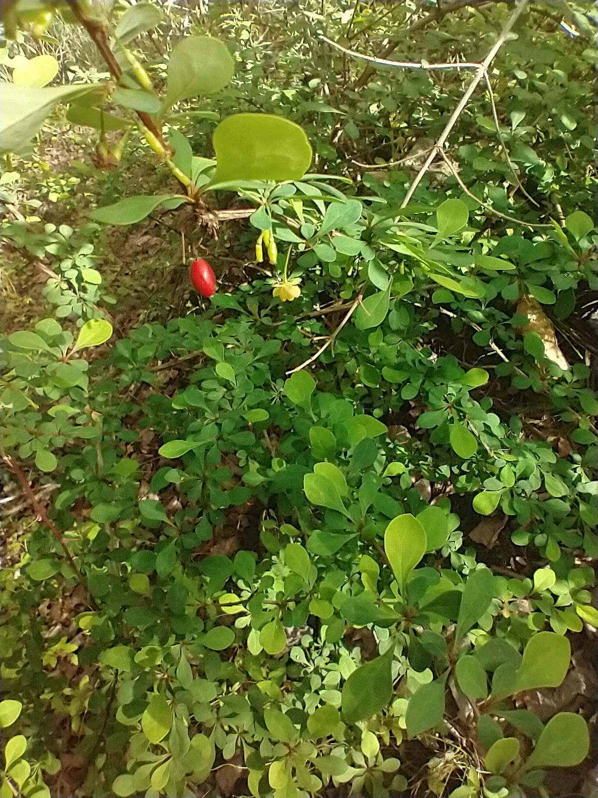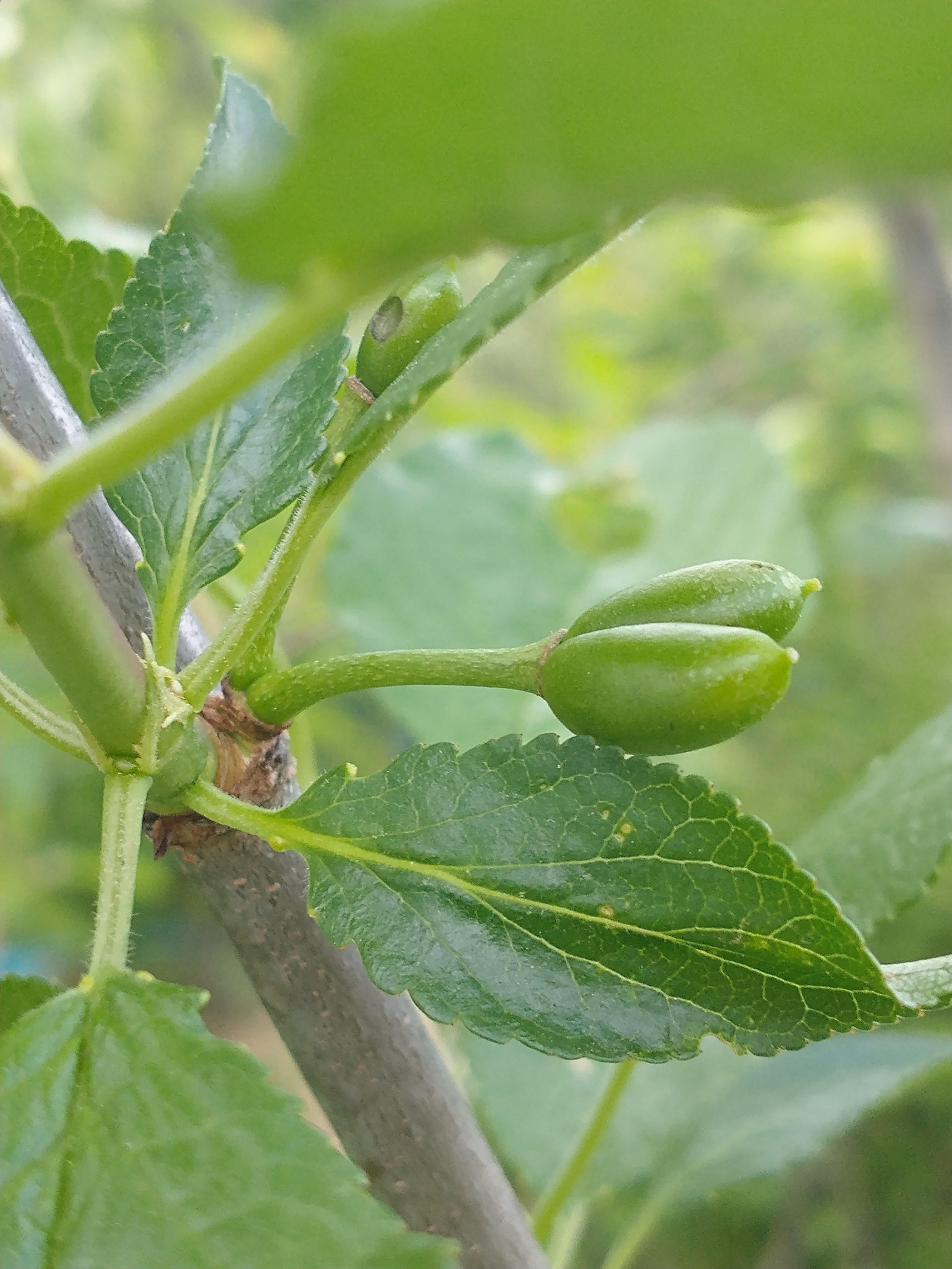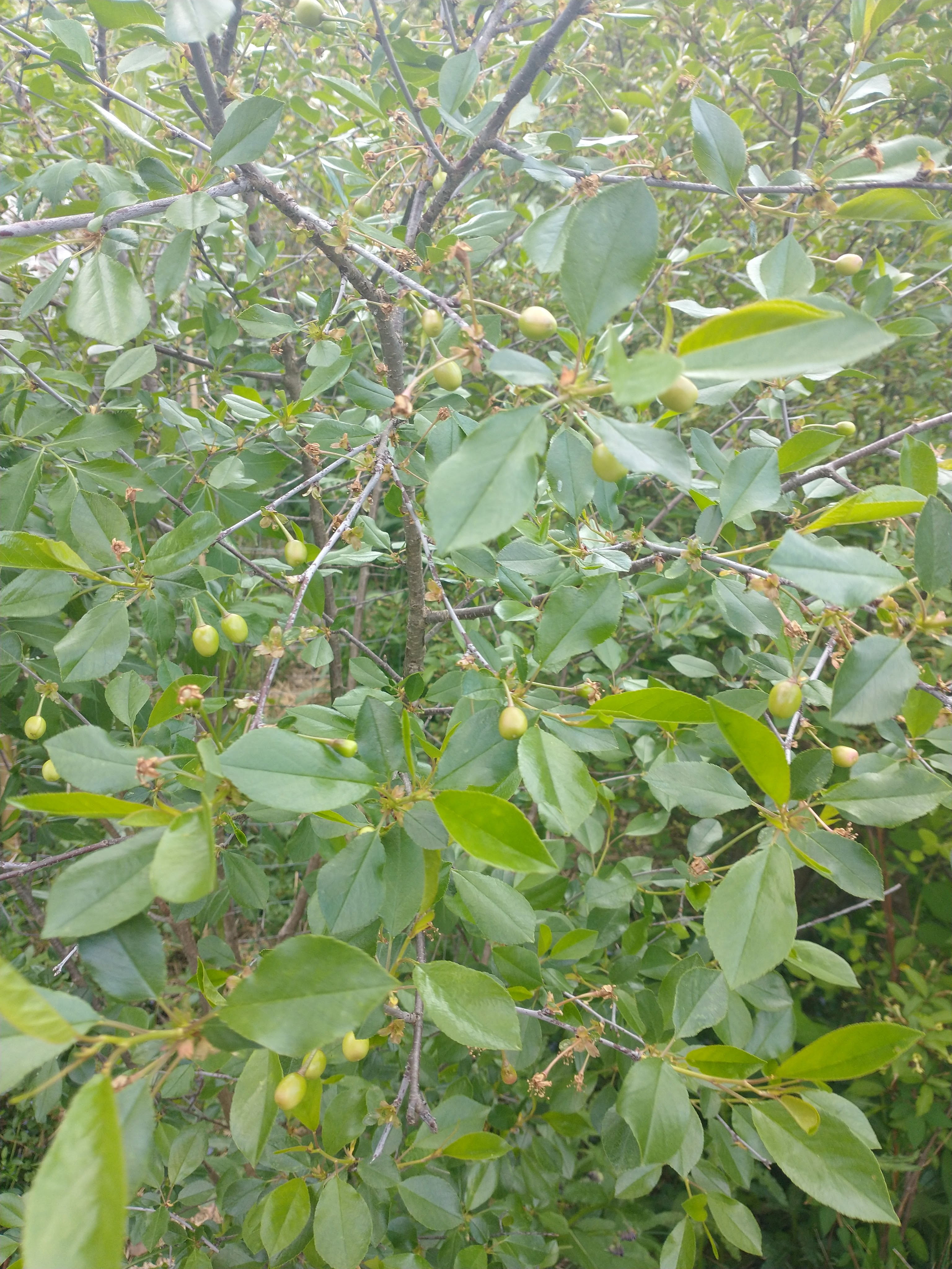 Black elderberry, rhubarb, hawthorn, crabapple, and barberry with a few odd freakishly early ripe fruit – a little more dry and nutty in flavor and texture than its fruit to come – which will also be dry and nutty, below. Barberry like autumn olive is an edible “invasive” – what makes certain plants “invasive” in parts of North America, in ways both problematic and useful? – various competitive factors like early to leaf and late to shed leaves, and highly propagative seeds, but mainly, as it turns out, that deer won’t eat them, likewise with the “invasive” non-edible bush and vine honeysuckles and privet, etc – deer inedibility being an otherwise beneficial feature of native plants like pawpaw, rudbeckia, yarrow… The deer herds artificially inflated by state governments across the US wipe out countless native species in many locales and regions. Where has all the wild black elderberry gone that we picked each year as children? ask the elders, who are systematically kept in the dark by wealthy vested interests. Well, ask the deer. Black Elderberry and many other native bushes could have been used to reclaim strip mines as readily and more beneficially than the widely used autumn olive, except for the federal government’s unwillingness to credit the money to create the jobs needed to do so, and the unwillingness to protect anything from deer. Caterpillars won’t eat autumn olive and some other non-native plant leaves either, thus a huge blow is struck against the ecosystem by an excess of non-native plants, including to the many songbirds who depend upon an abundance of caterpillars to survive and raise their young. (See the work of Doug Tallamy and others.) In my view, non-native fruiting plants can make for a wonderful addition mixed in with many natives in yard or orchard. Apples, for example, are not native to the US and can be invasive, on abandoned pastures in particular but are more than welcome to the mix. Meanwhile, wildlife and the ecology will benefit by our fostering an abundance of native species, growing with wonderful non-natives, many of which have long-since naturalized.