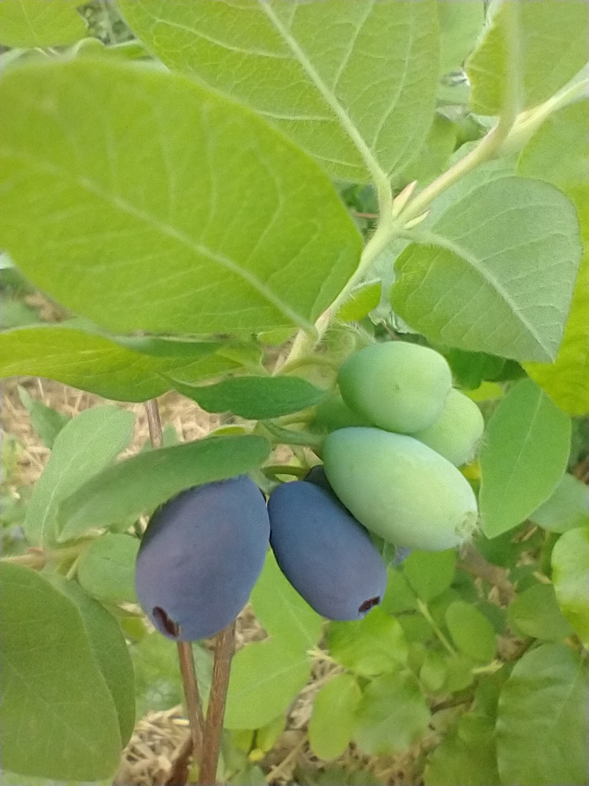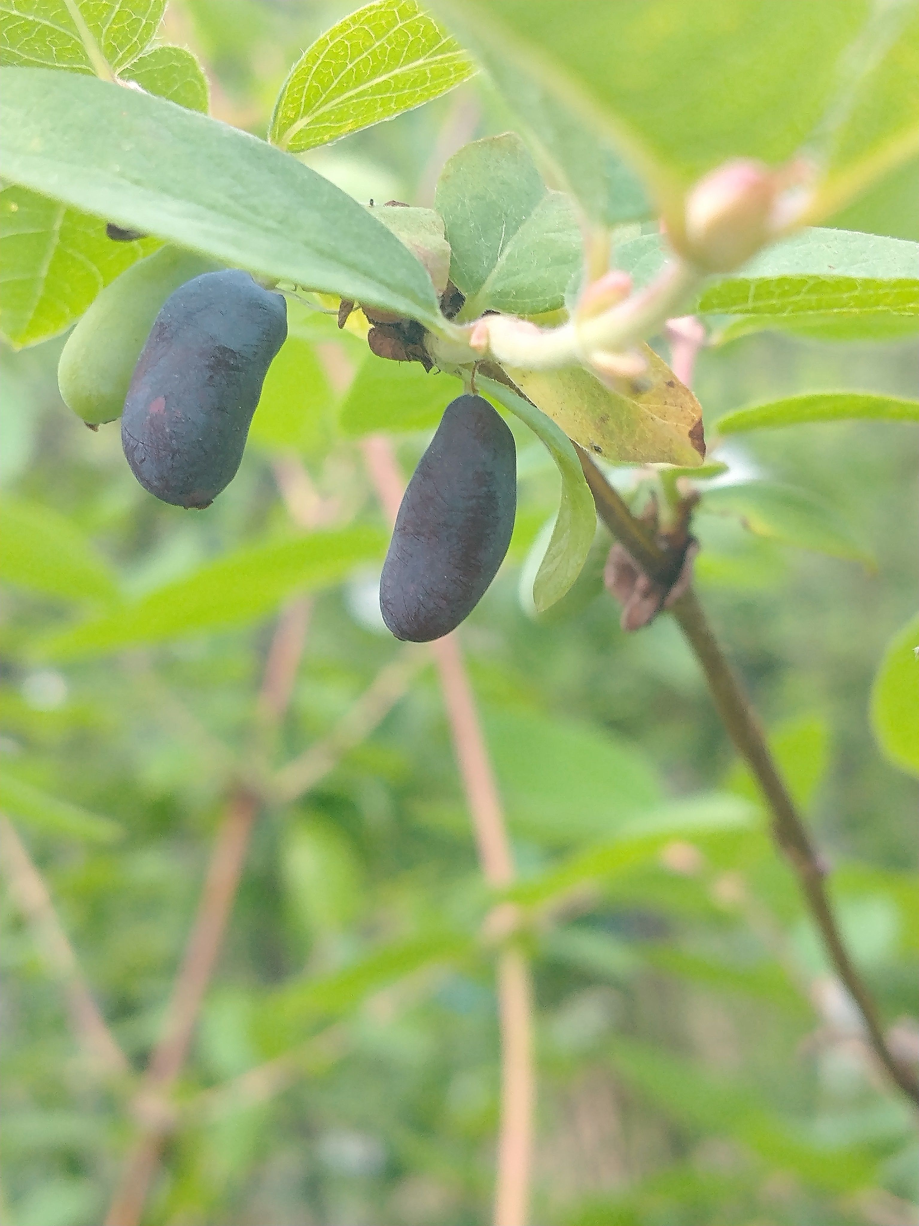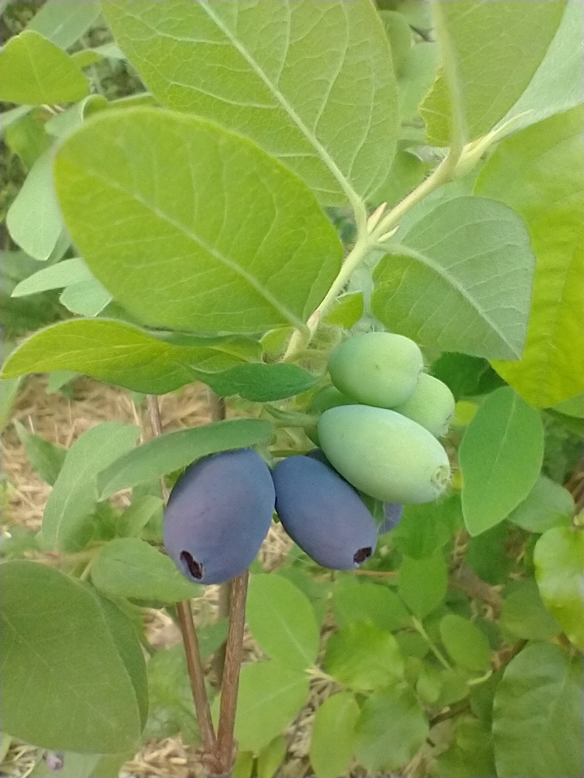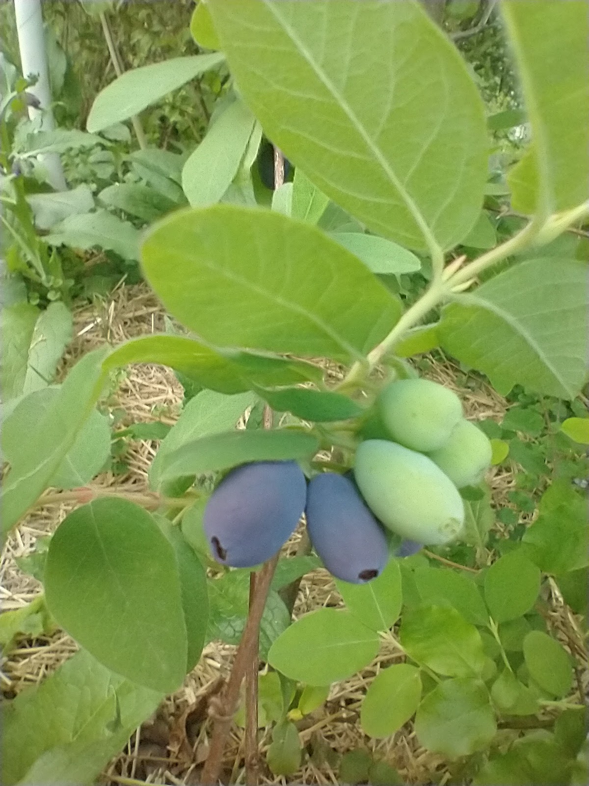 Edible blue honeysuckle (haskap or honeyberry) – though not related to blueberry, the color and flavor and size, if not shape, of haskap is similar to blueberry, and with the wild forms of blue honeysuckle being circumpolar and growing north toward the arctic, it’s interesting to think of this fruit as an arctic blue berry – edible even at this early stage of color, a tart burst: