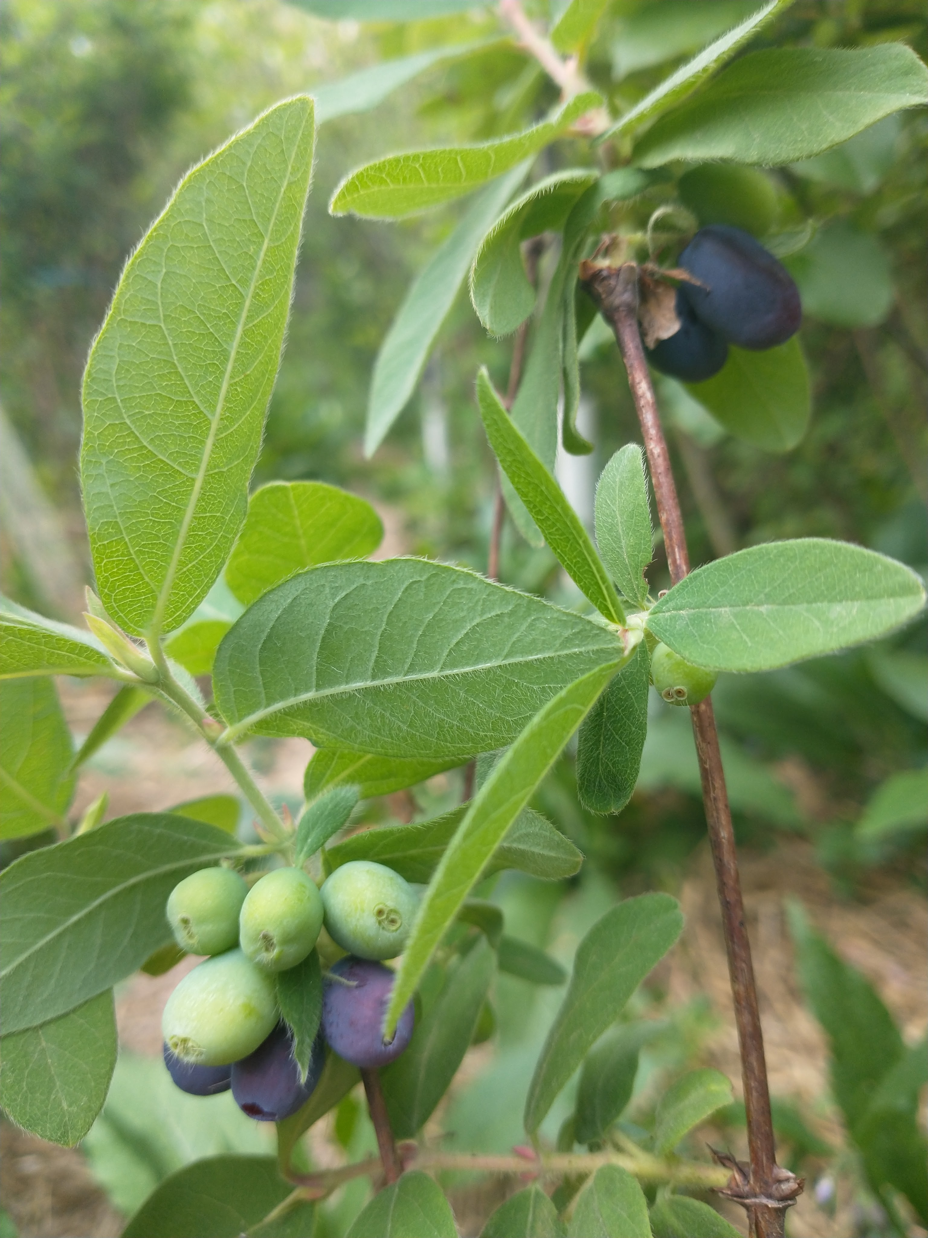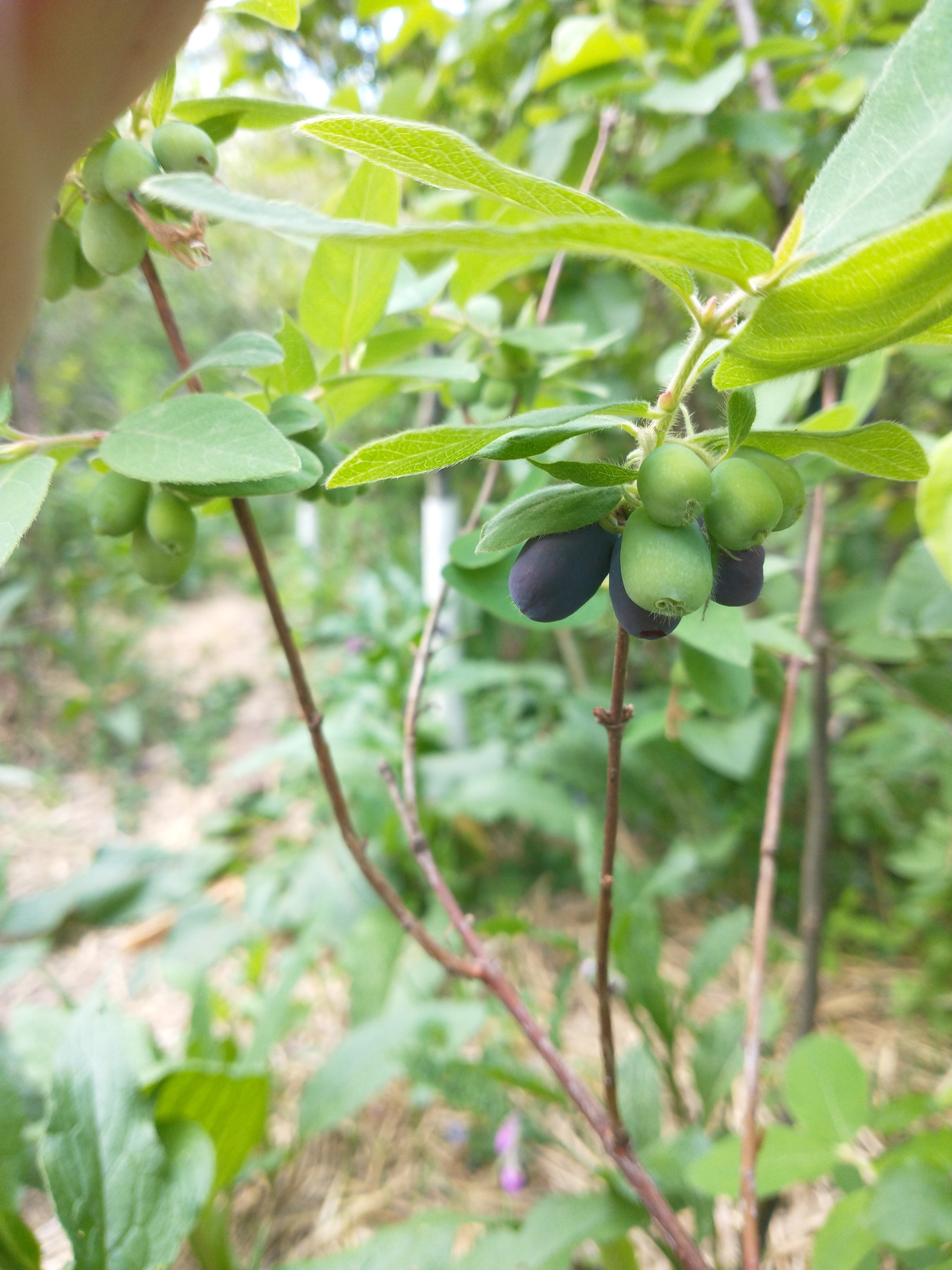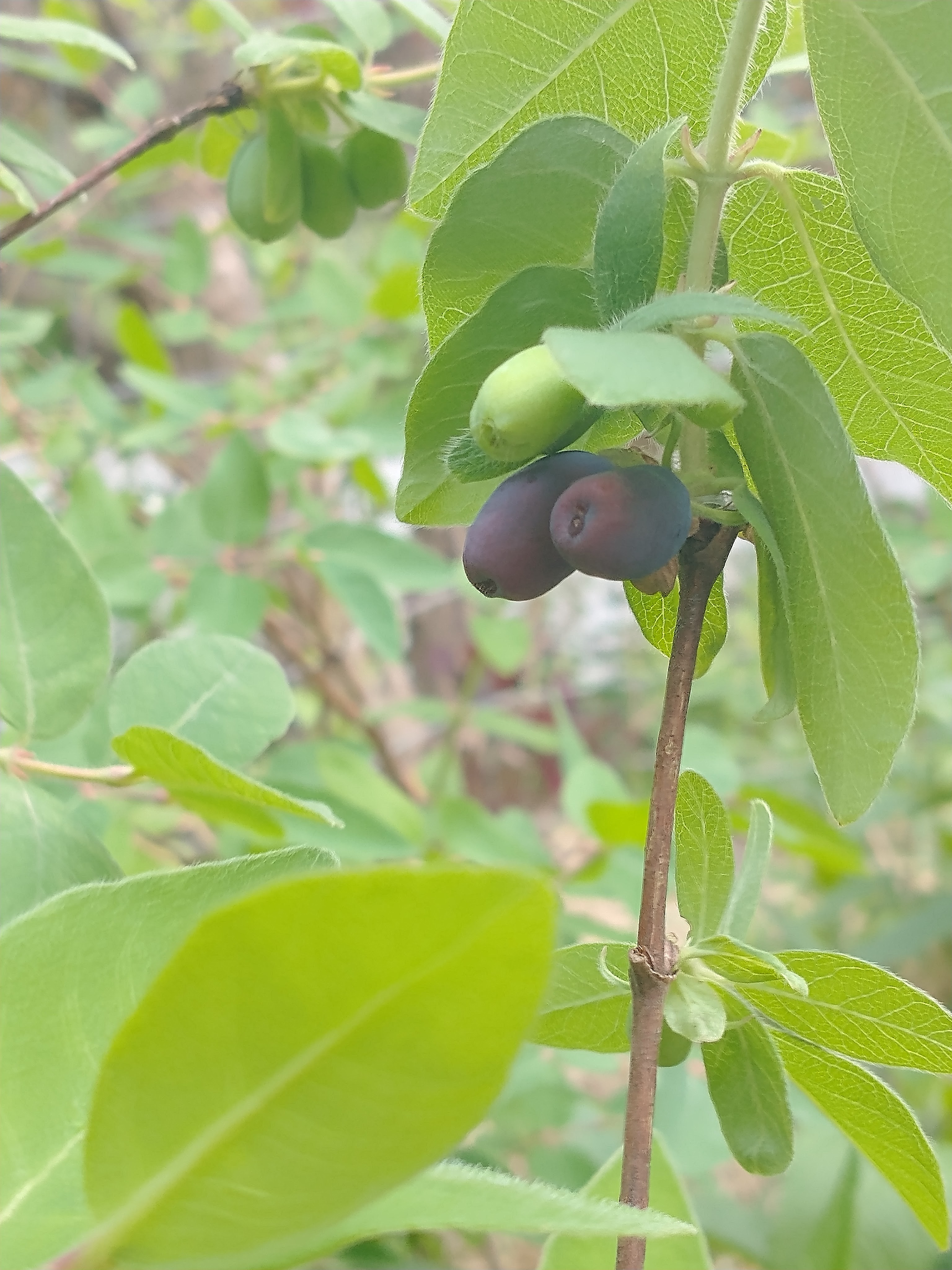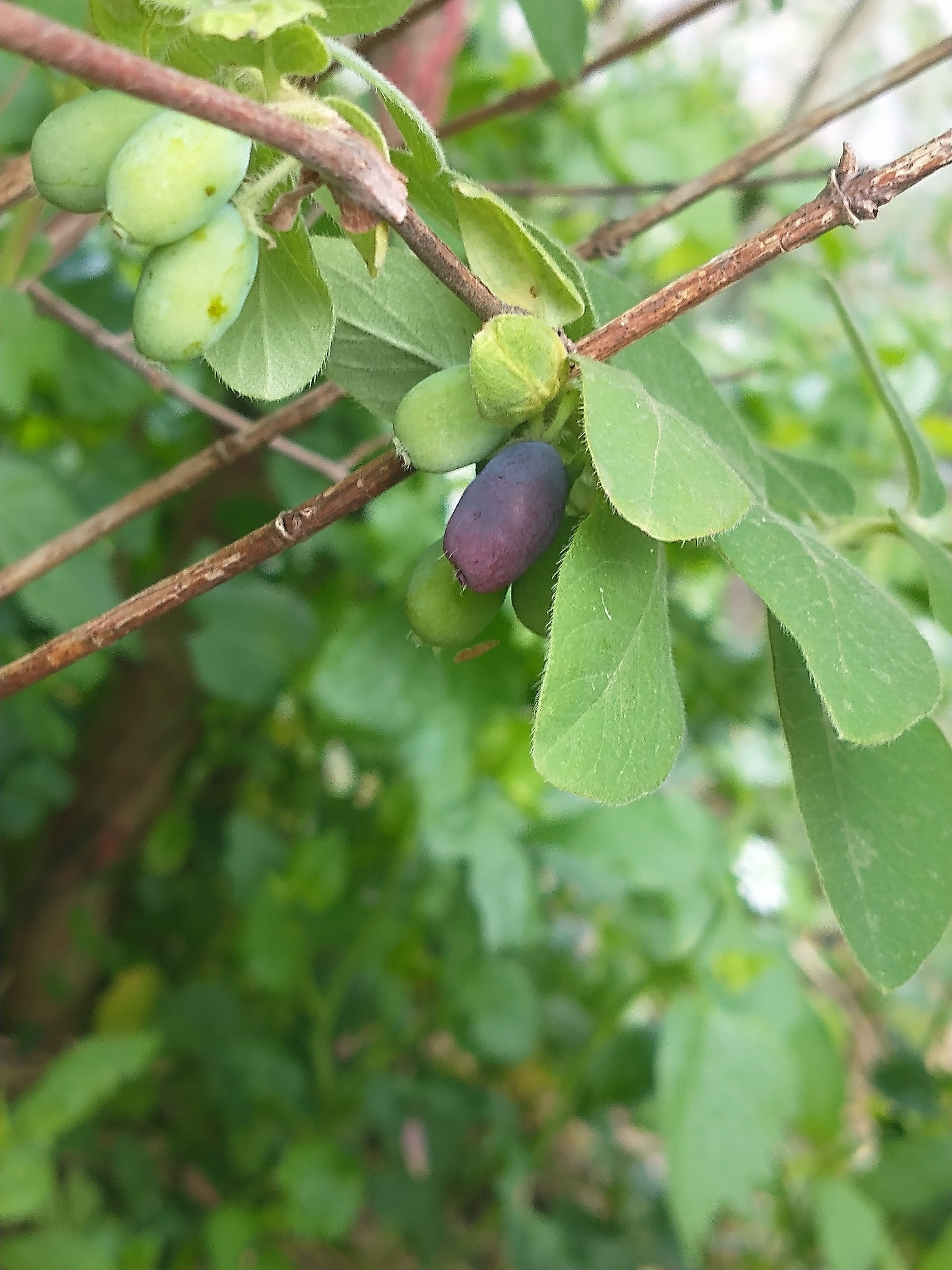 Edible blue honeysuckle (haskap or honeyberry) – though not related to blueberry, the color and flavor and size, if not shape, of haskap is similar to blueberry, and with the wild forms of blue honeysuckle being circumpolar and growing north toward the arctic, it’s interesting to think of this fruit as an arctic blue berry – edible even at this early stage of color, a tart burst: