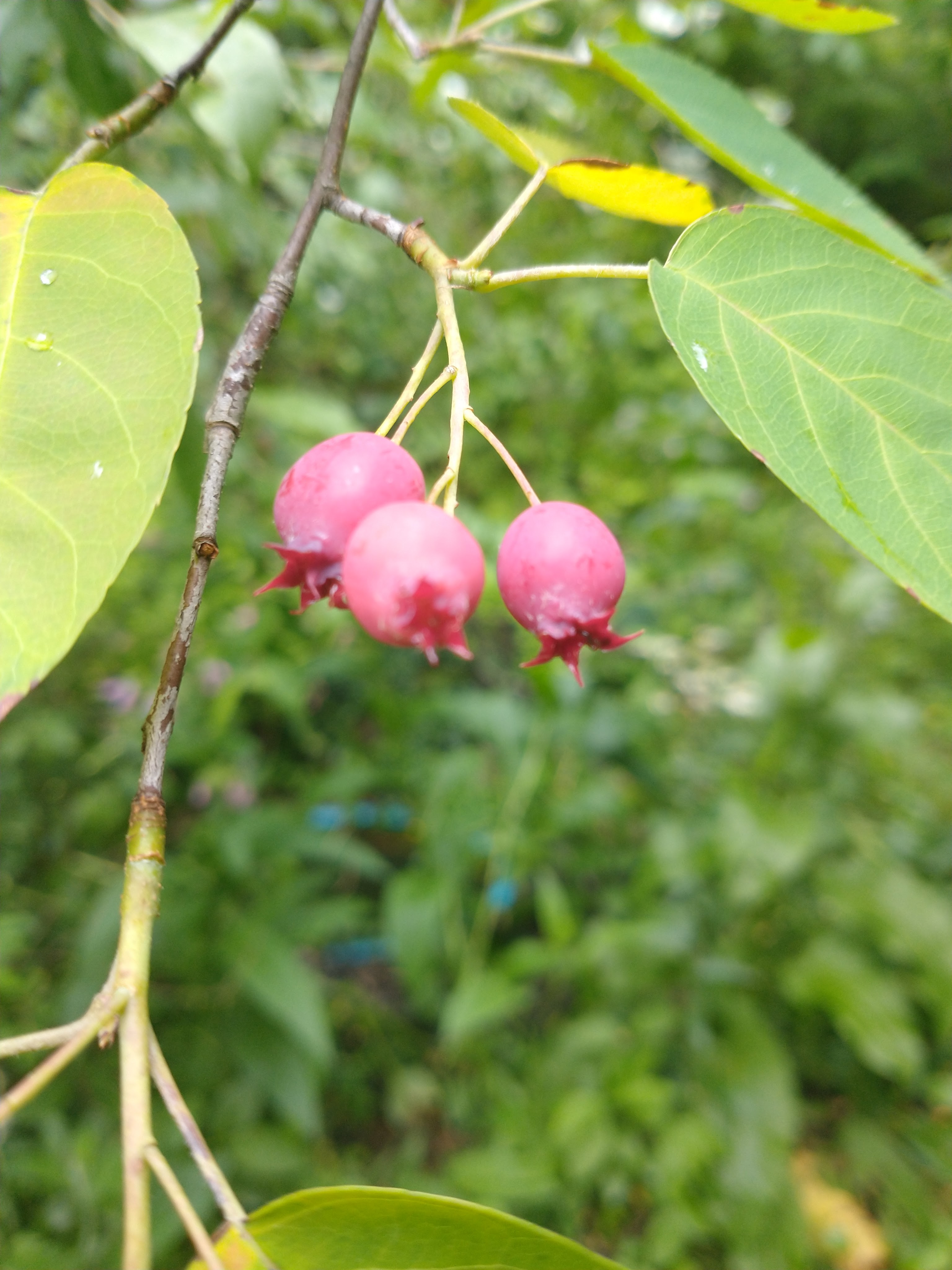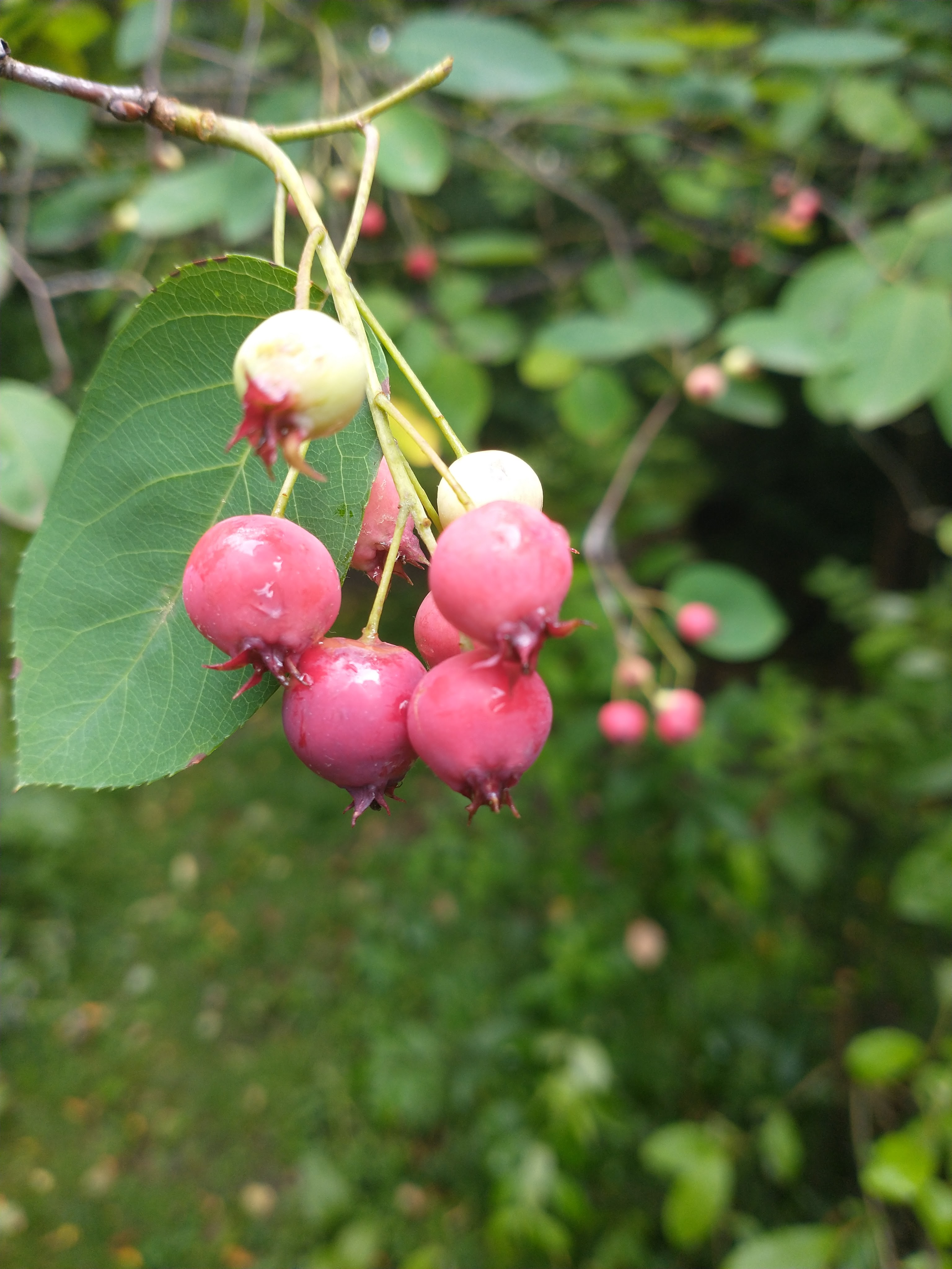 Birds’ favorite, juneberry now ripening, following honeyberry/haskap, goumi, and Nanking cherry. First Carmen Jewel bush cherries also ripe today, but unlike juneberry, CJ blossoms were decimated by frost resulting in a much smaller crop than juneberry.